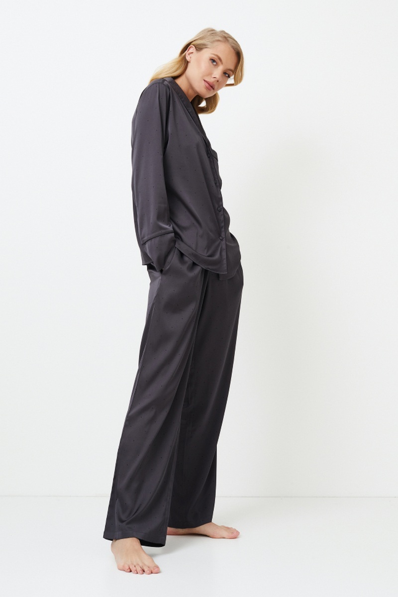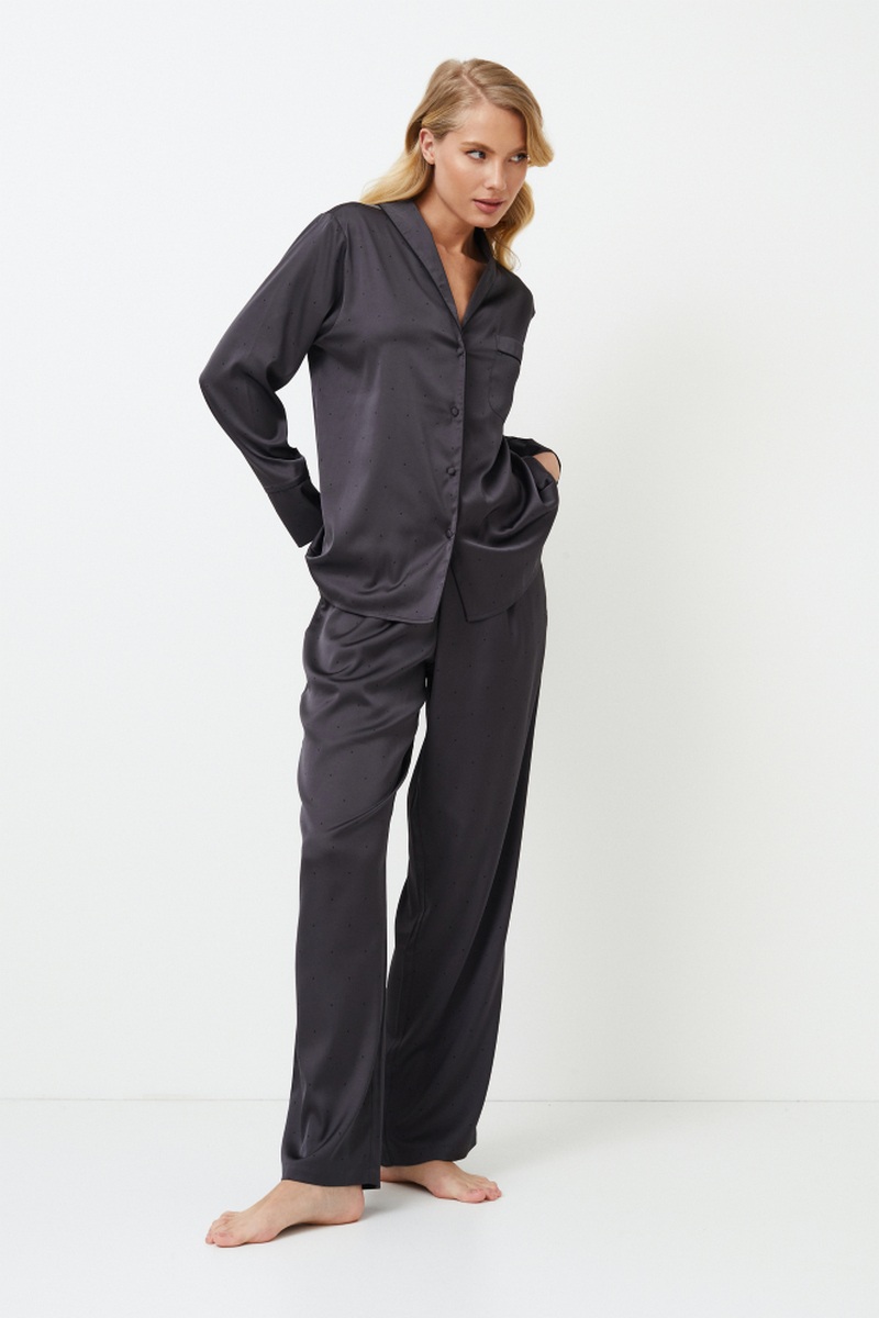 Представляем длинную пижаму Agatha - темный и смелый выбор для тех, кто предпочитает минимализм. Рубашка с длинными рукавами застегивается спереди на пуговицы и имеет соблазнительный округлый V-образный вырез горловины, а широкие брюки с карманами и тонким регулируемым поясом придают комплекту элегантности. Комплект украшен черной окантовкой по краям. Пижама изготовлена из блестящей плотной темно-серой ткани в мелкий черный горошек, которая создает ауру элегантности и гламура, идеально подходящую для тех, кто любит выделяться даже в ночной тишине. Раскройте свою внутреннюю драму с длинной пижамой Agatha.