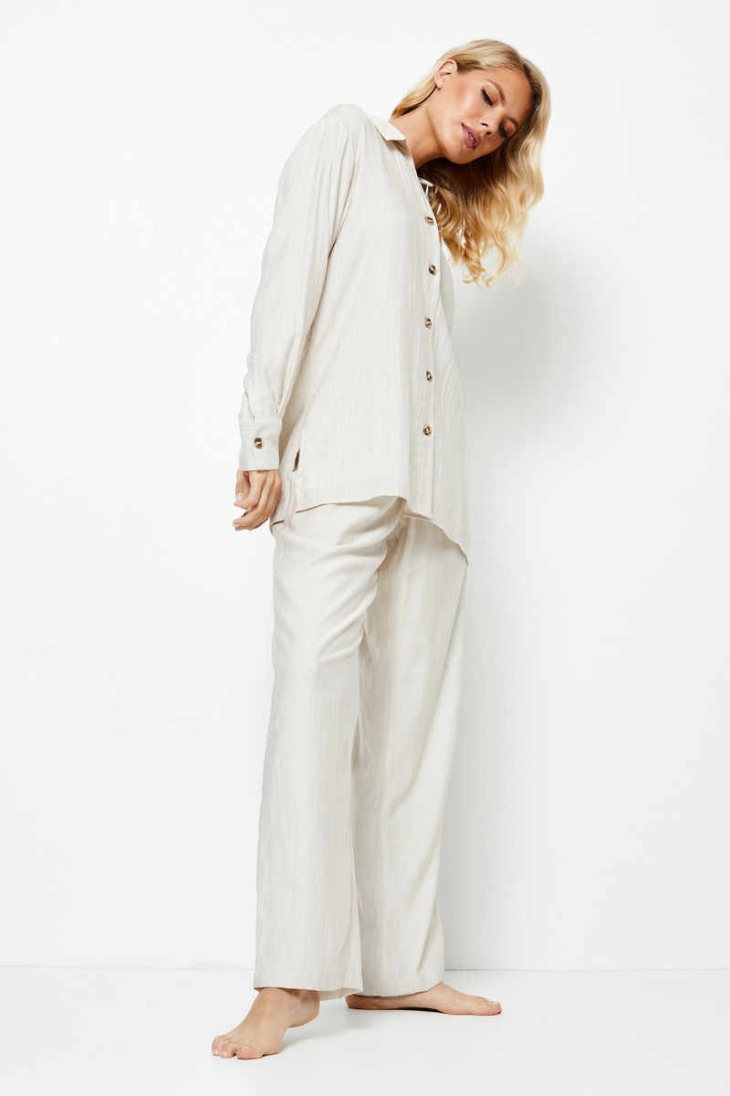 Комплект Amara легко сочетает в себе стиль и комфорт, создавая уютный образ, который идеально подойдет для любого повседневного случая, от ленивого дня дома до стильной прогулки по пляжу. Рубашка выполнена в классическом стиле, отличается изысканными манжетами на пуговицах и шикарными разрезами по бокам, что делает ее идеальным как для отдыха в помещении, так и на пляже. Брюки имеют пояс с регулируемыми завязками, дополнены металлическими украшениями, практичные карманы обеспечут стиль и комфорт.