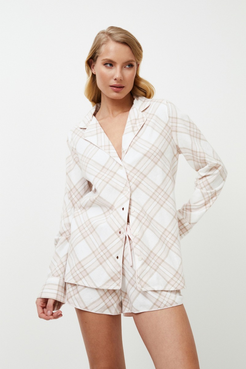 Короткая пижама Camille - это вечная классика мягких оттенков. Пижама выполнена из мягкого хлопка в спокойную белую, бежевую и розовую клетку. Топ с длинными рукавами и застежкой на пуговицы, V-образным вырезом горловины и изящной вышивкой "Мечта" на спине придает модели утонченную элегантность. Шорты классического кроя с закругленными углами. Они завязываются на талии нежным розовым бантом. Воротник рубашки, манжеты рукавов и низ шорт украшены кантом. Наденьте короткую пижаму Camille для спокойного и стильного ночного отдыха. Изделие выполнено из хлопкового фланеля.