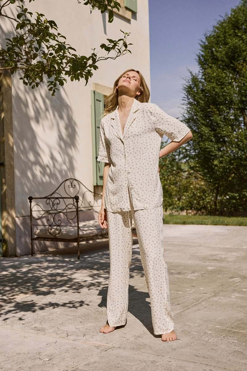Представляем вашему вниманию пижаму с шортами CAPRIELLE - воплощение мечты. Изготовлена из лёгкой вискозы. Рубашка на пуговицах с короткими рукавами, окантовкой на рукавах и V-образным вырезом с отложным воротником. Шорты с эластичным поясом с завязкой. Этот комплект излучает само очарование.