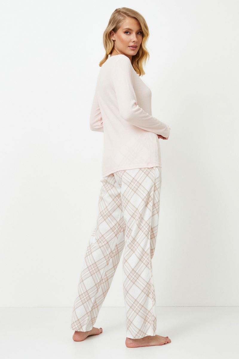 Длинная пижама Claudia выполнена в мягких оттенках для тех, кто любит нейтральные цвета. Топ с длинными рукавами выполнен из мягкой вискозы пастельно-розового цвета. У него круглый вырез и небольшая вышивка в виде короны на груди. Брюки выполнены из матового хлопка в белую, бежевую и розовую клетку. Они классического кроя, завязываются на талии розовым бантом и украшены элегантной окантовкой по бокам. Носите пижаму Claudia long для спокойного и стильного ночного отдыха. Футболка: 95% вискоза, 5% эластан Брюки: 100% хлопковый фланель