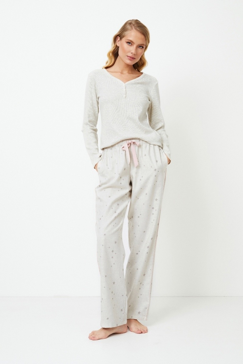 Представляем длинную пижаму Dorothea, в которой комфорт сочетается с очарованием под звездным небом. Пижама выполнена из мягкого хлопка спокойного серого цвета с россыпью звезд. Топ с длинными рукавами на пуговицах, V-образным вырезом горловины и манжетами, украшенными розовой окантовкой. В сочетании с брюками обычного кроя, завязывающимися на талии розовым бантом, также с карманами, чтобы вы могли держать все необходимое под рукой. Брюки также украшены розовой окантовкой по низу. Почувствуйте уютную элегантность пижамы Dorothea, которая подойдет для стильных ночей, наполненных мечтами. И помните, что ношение этой пижамы практически гарантирует, что ваши сны будут такими же стильными, как и ваша одежда для сна! Изделие выполнено из хлопкового фланеля.