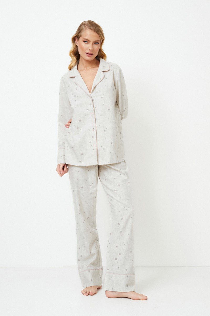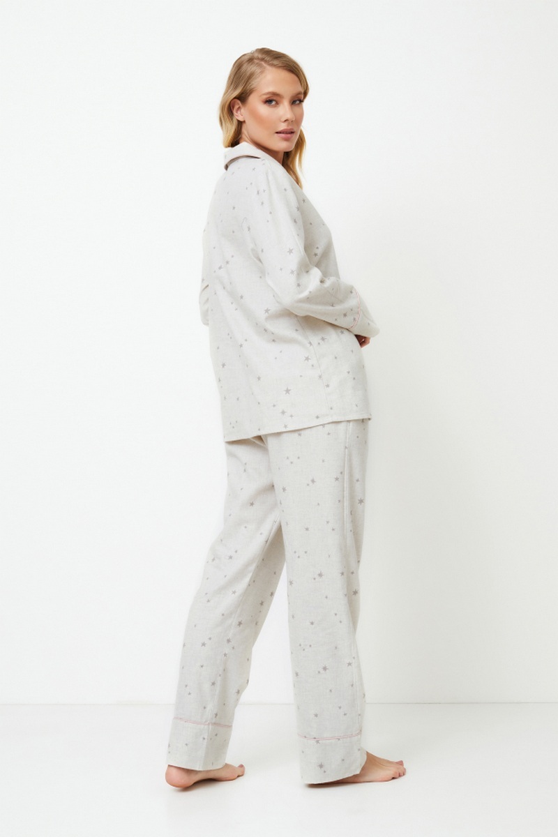 Представляем длинную пижаму Dorothea, в которой комфорт сочетается с очарованием под звездным небом. Пижама выполнена из мягкого хлопка спокойного серого цвета с россыпью звезд. Топ с длинными рукавами на пуговицах, V-образным вырезом горловины и манжетами, украшенными розовой окантовкой. В сочетании с брюками обычного кроя, завязывающимися на талии розовым бантом, также с карманами, чтобы вы могли держать все необходимое под рукой. Брюки также украшены розовой окантовкой по низу. Почувствуйте уютную элегантность пижамы Dorothea, которая подойдет для стильных ночей, наполненных мечтами. И помните, что ношение этой пижамы практически гарантирует, что ваши сны будут такими же стильными, как и ваша одежда для сна! Изделие выполнено из хлопкового фланеля.