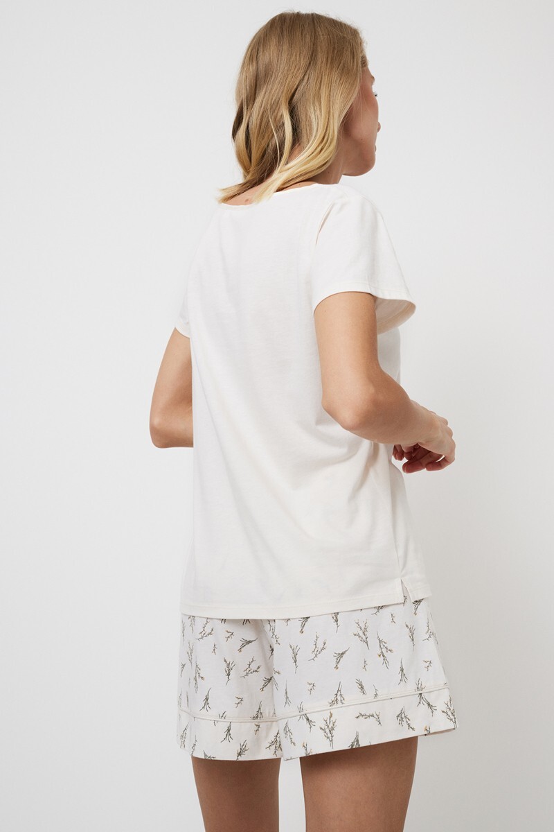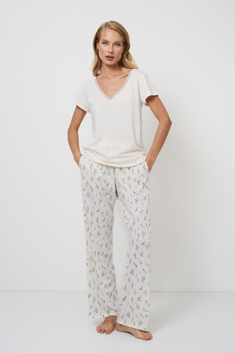 Представляем вашему вниманию женственную длинную пижаму Dulce. Этот комплект, изготовленный из смеси хлопка и модала, который ощущается как мечта, создан для того, чтобы сделать сон приятным и уютным. Футболка кремового цвета с короткими рукавами, имеет V-образный вырез, украшенный кружевными деталями, и изящные разрезы по бокам для дополнительного шика. Брюки с нежным цветочным узором на кремовом фоне украшены поясом с бантом, боковыми кантами и карманами для хранения всего необходимого перед сном. Наденьте длинную пижаму Dulce и приготовьтесь погрузиться в мир грёз.