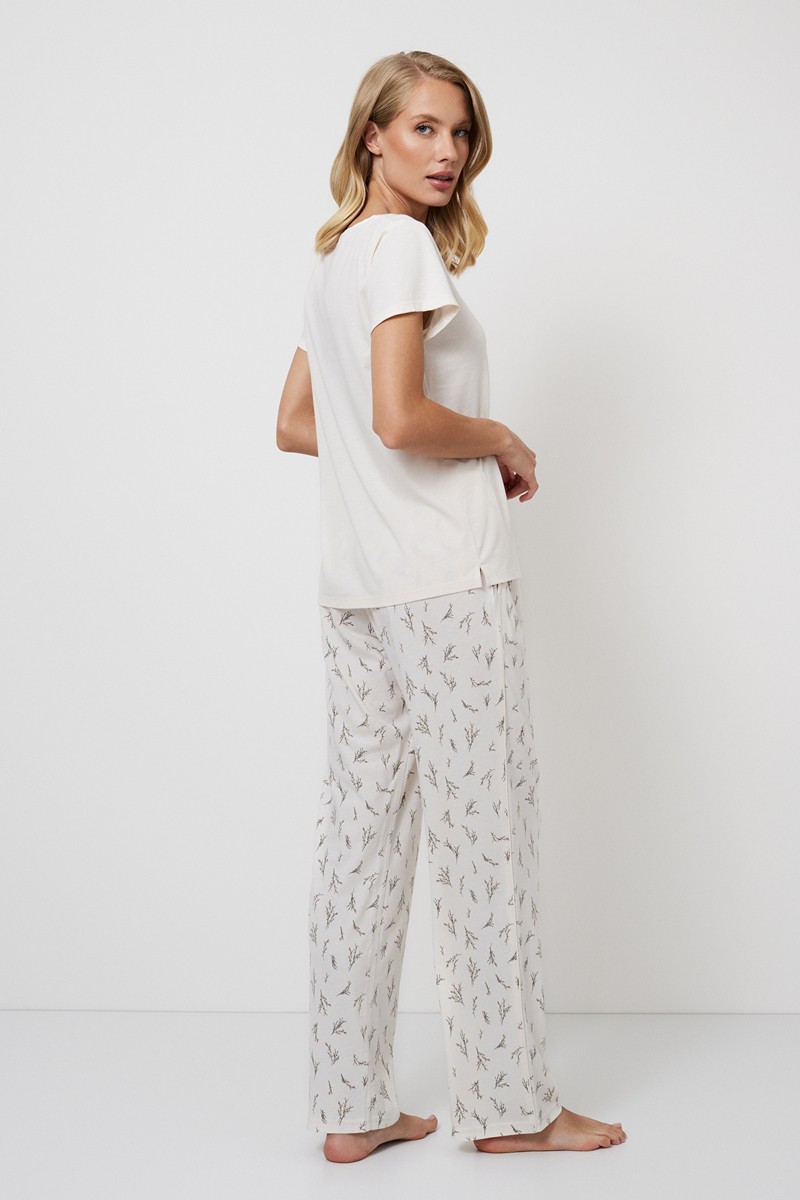 Представляем вашему вниманию женственную длинную пижаму Dulce. Этот комплект, изготовленный из смеси хлопка и модала, который ощущается как мечта, создан для того, чтобы сделать сон приятным и уютным. Футболка кремового цвета с короткими рукавами, имеет V-образный вырез, украшенный кружевными деталями, и изящные разрезы по бокам для дополнительного шика. Брюки с нежным цветочным узором на кремовом фоне украшены поясом с бантом, боковыми кантами и карманами для хранения всего необходимого перед сном. Наденьте длинную пижаму Dulce и приготовьтесь погрузиться в мир грёз.