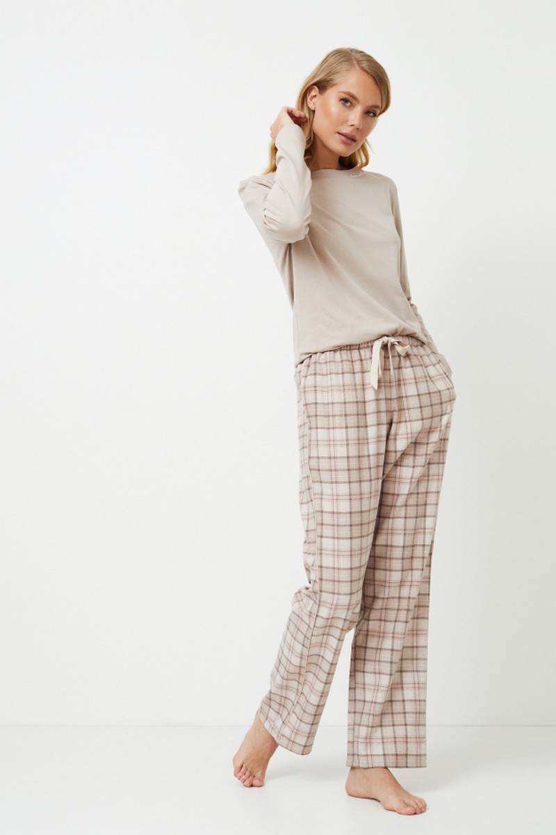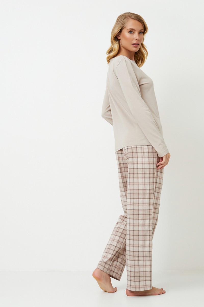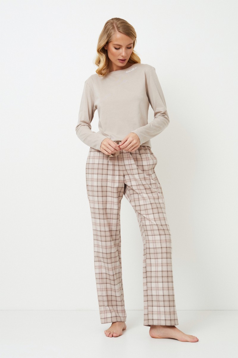 Представляем вашему вниманию длинную пижаму Ella, в которой комфорт сочетается со стилем без особых усилий. Верх выполнен из мягкой ткани бежевого цвета, сочетающей хлопок и модал. Длинные рукава, круглый вырез и очаровательная вышивка "Мечтай с нами". Этот комплект сочетается с хлопковыми брюками в клетку приглушенного коричневого цвета. Брюки имеют удобные карманы, завязку на талии и элегантную окантовку по бокам. Пижама Ella pajama long, которая идеально подходит для стильного отдыха, украсит ваш образ. Кофта: 50% хлопок, 50% модал Брюки: 100% хлопок фланель.