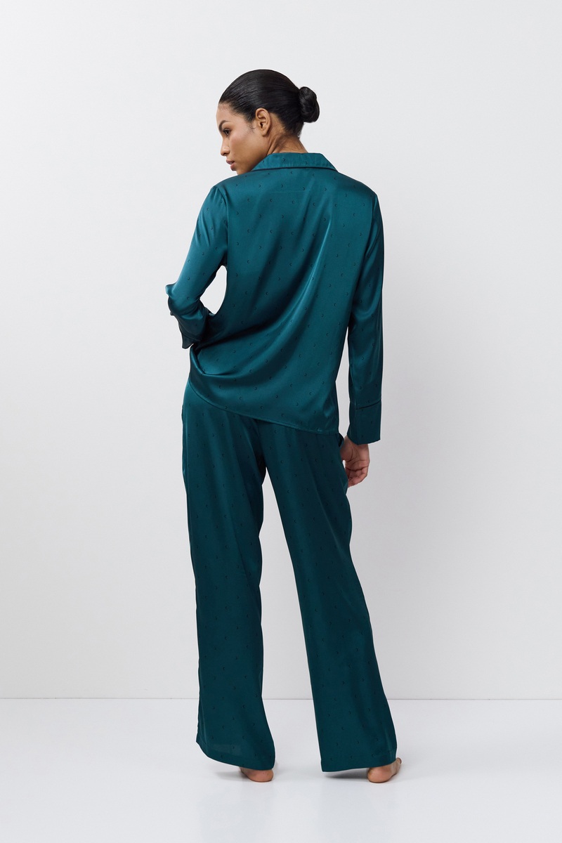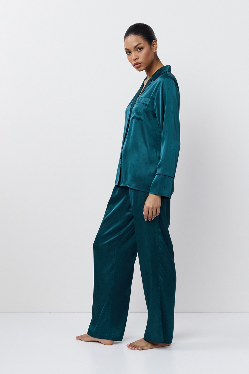 Пижама женская со штанами EMERALDA для вашего ночного комфорта. Пижама выполнена из шелковистой атласной ткани. Рубашка на пуговицах, с длинными рукавами, отложным воротником и нагрудным карманом. Окантовка дополняет и украшает комплект. Штаны свободные, с эластичным поясом с завязкой. Расслабьтесь с максимальным комфортом и стилем в пижаме EMERALDA.