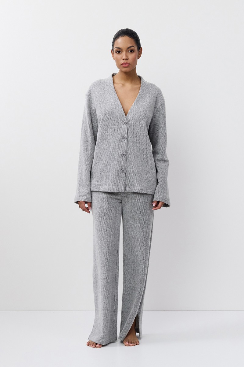 Комплект женский со штанами EUGENIE SET. Комплект выполнен с легким начесом. Кардиган с длинными рукавами, на пуговицах, V-образный вырез горловины. Штаны длинные, свободной формы, с эластичным поясом и боковыми карманами, по бокам разрезы. Расслабьтесь с максимальным комфортом и стилем в комплекте EUGENIE.