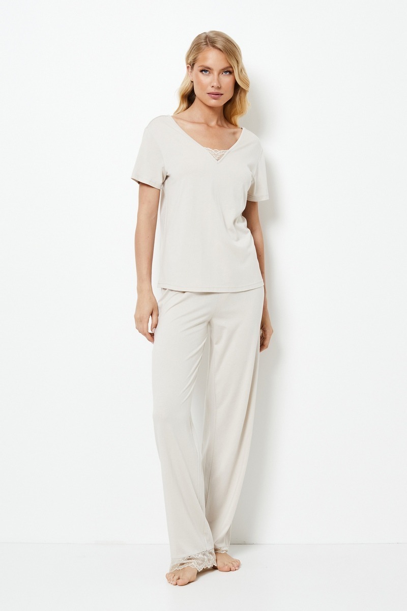Почувствуйте элегантность и женственность в пижаме Evelyn long, выполненной из мягкой трикотажной хлопково-модальной ткани. Футболка с короткими рукавами и соблазнительным v-образным вырезом спереди и сзади, каждый из которых элегантно обрамлен нежным кружевом, придающим ей нотку изысканности. Брюки имеют пояс с регулируемым бантом и красиво отделаны кружевом по низу. Этот пижамный комплект идеально подходит для тех, кто ценит нотку комфорта в своей ночной одежде. Легко сочетайте его с халатом Evelyn!