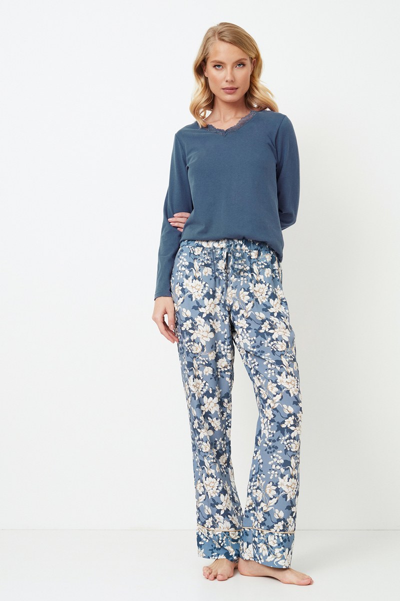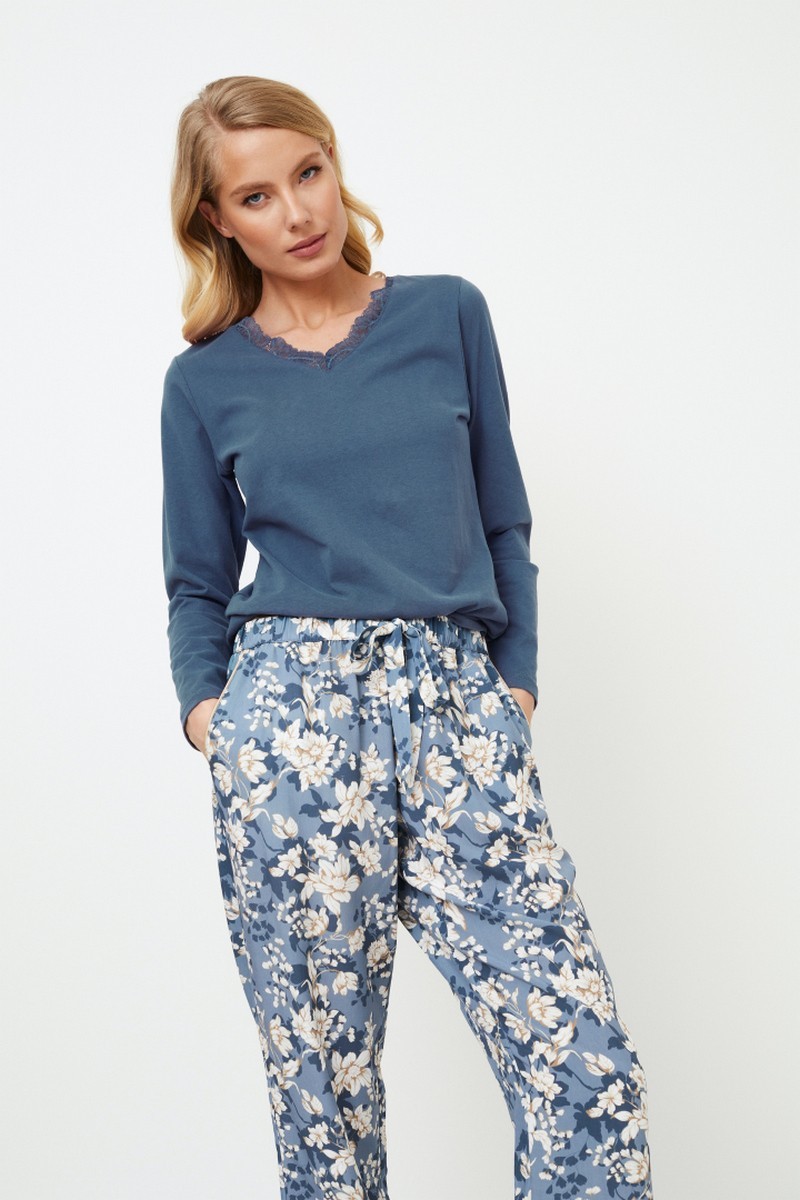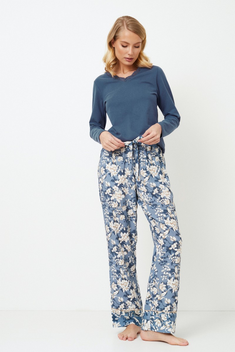 Представляем вашему вниманию длинную пижаму Fleur, восхитительный выбор для ночного отдыха. Топ выполнен из трикотажной ткани из смеси хлопка и полиэстера однотонного синего цвета. Вырез украшен изящными кружевными вставками, придающими ему легкую элегантность. Брюки выполнены из легкой вискозы с очаровательным голубым цветочным рисунком. Брюки украшены кантами вдоль карманов и строчкой внизу. Эластичный пояс. Этот пижамный комплект идеально подходит для уютных вечеров, предлагая комфорт и очарование. Приготовьтесь к тому, что с пижамой Fleur pajama long время отхода ко сну станет самым ярким моментом вашего дня, потому что почему все веселье должно приходиться на дневное время? Кофта: 60% текстильный хлопок, 40% полиэстер. Брюки: 100% вискоза.