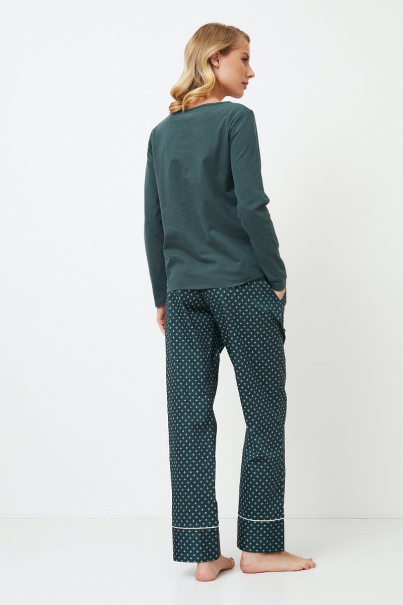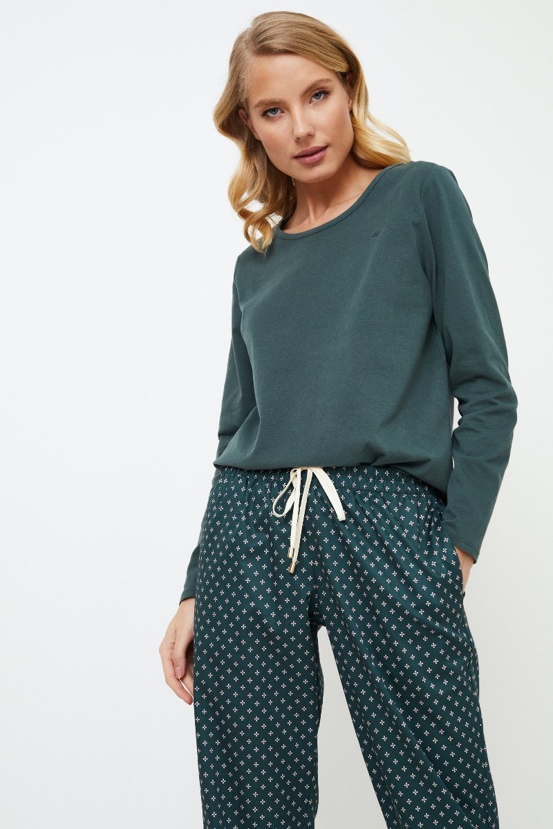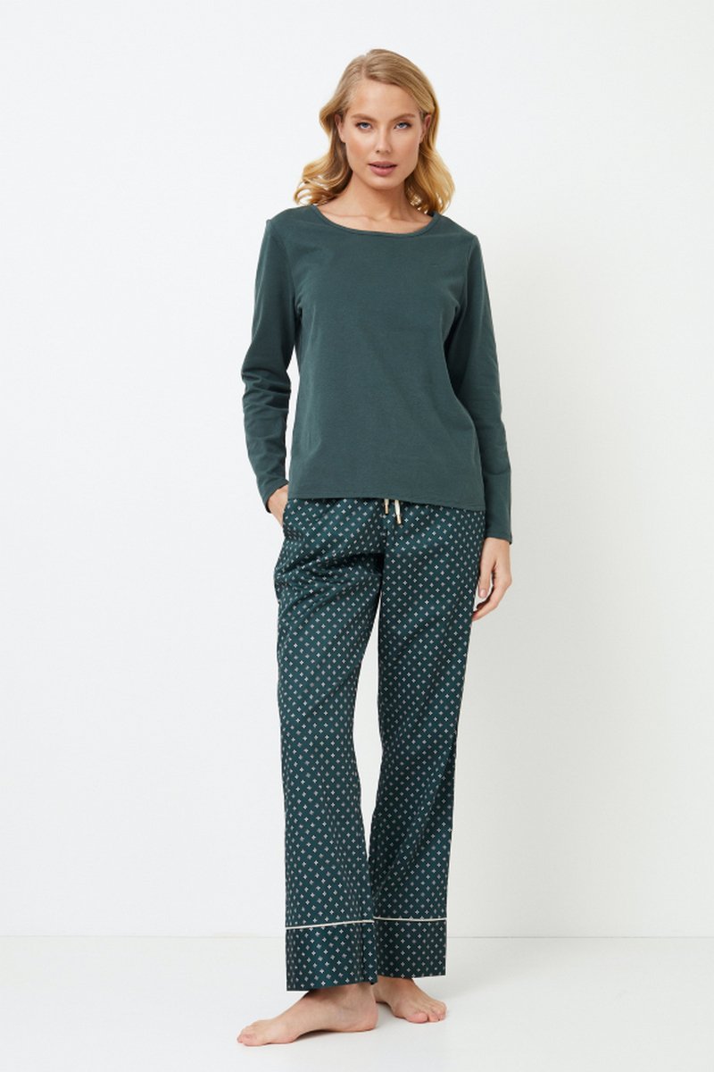 Представляем вашему вниманию длинную пижаму Griselle, уютное и в то же время стильное дополнение к вашей коллекции пижам. Топ из мягкого хлопка и полиэстера с округлым вырезом однотонного изумрудного цвета придает изделию элегантности. Брюки выполнены из блестящей хлопчатобумажной ткани изумрудно-зеленого цвета с роскошным геометрическим рисунком. Они украшены потайными карманами, окантовкой в тон и регулируемой талией с золотистыми вставками на манжетах. Длинная пижама Griselle, идеально подходящая для отдыха или сна, гармонично сочетает в себе комфорт и элегантность. Кофта: 60% текстильный хлопок, 40% полиэстер Брюки: 100% шелковистый текстильный хлопок