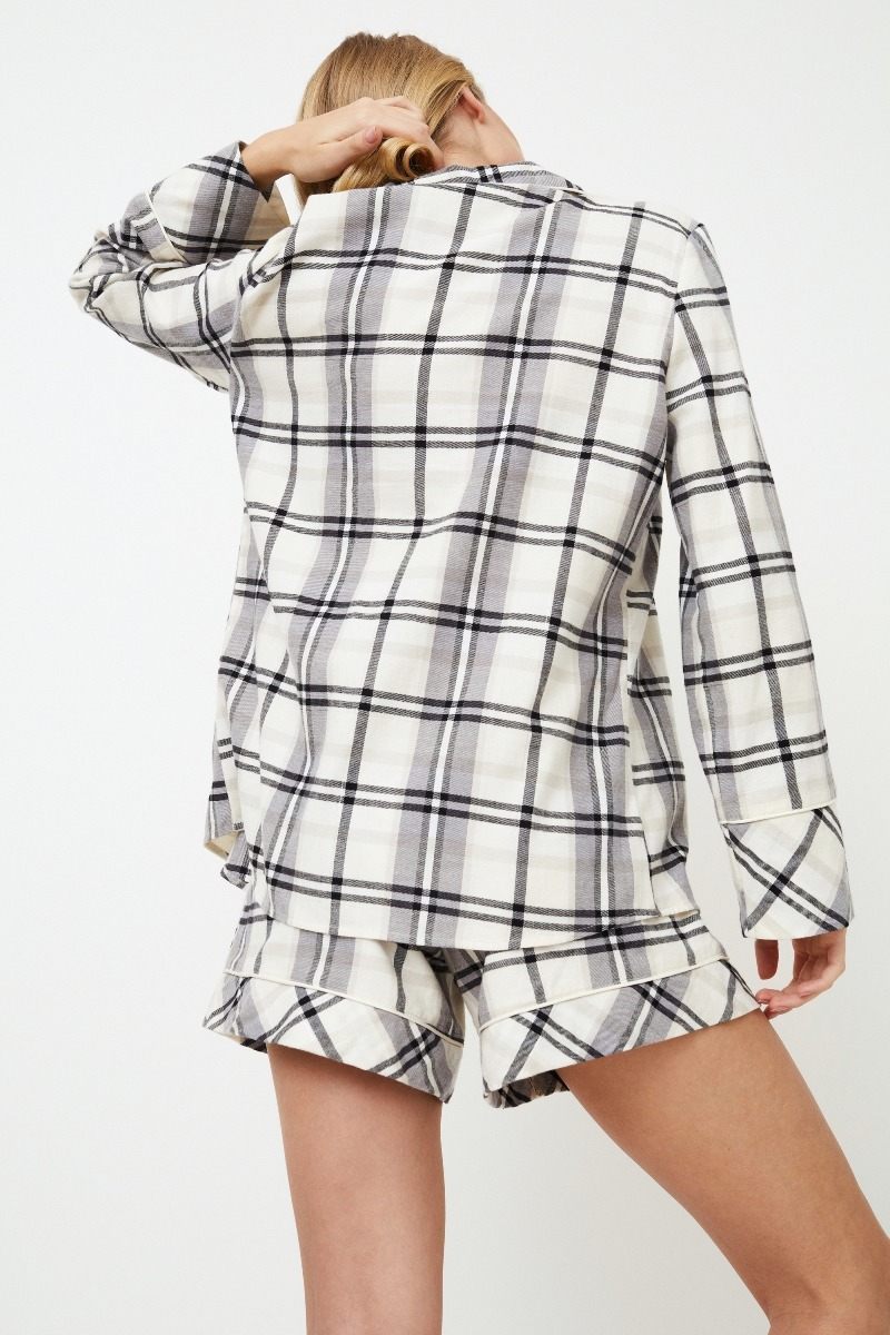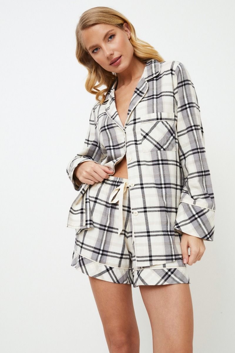 Представляем короткую пижаму Henrietta, в которой комфорт сочетается со стилем в каждой детали. Изготовлена из мягкого хлопка и украшена вечным рисунком в белую и серую клетку. Рубашка с длинными рукавами, V-образным вырезом горловины, застежкой спереди на пуговицы, манжетами на рукавах и нагрудным карманом дополнена окантовкой. В сочетании с шортами классического кроя с окантовкой по низу, завязывающимися на талии и карманами, этот комплект обеспечивает комфорт и функциональность. Расслабьтесь с максимальным комфортом и стилем в короткой пижаме Henrietta, созданной для того, чтобы скрасить ваши вечера непревзойденным уютом и изысканностью. Изделие выполнено из хлопкового фланеля.