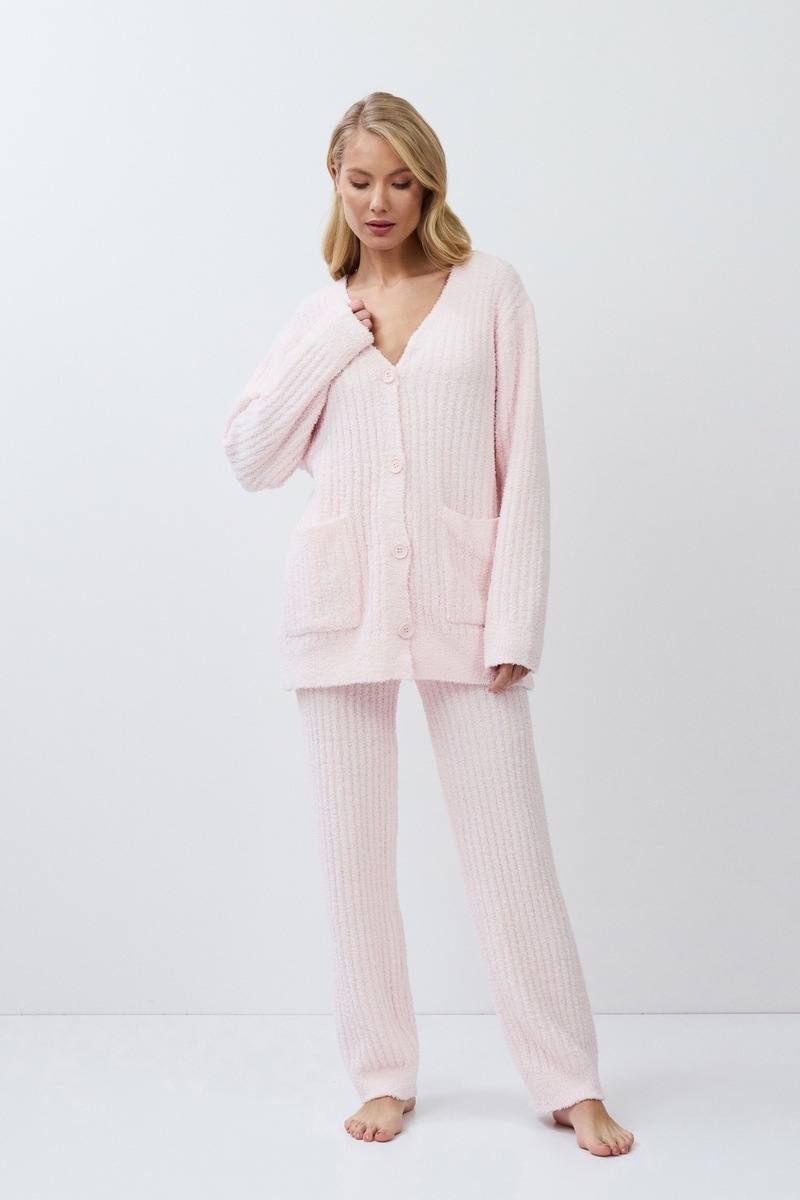 Комплект JESSICA SET SOFT - это то, что вам нужно для максимального комфорта и стиля. Этот комплект состоит из кардигана с длинными рукавами, на пуговицах и двух удобных накладных карманов; комфортных свободных штанов с эластичным поясом. Комплект выполнен из мягкой приятной телу ткани, он словно окутан облаком.
