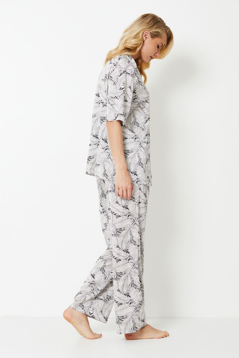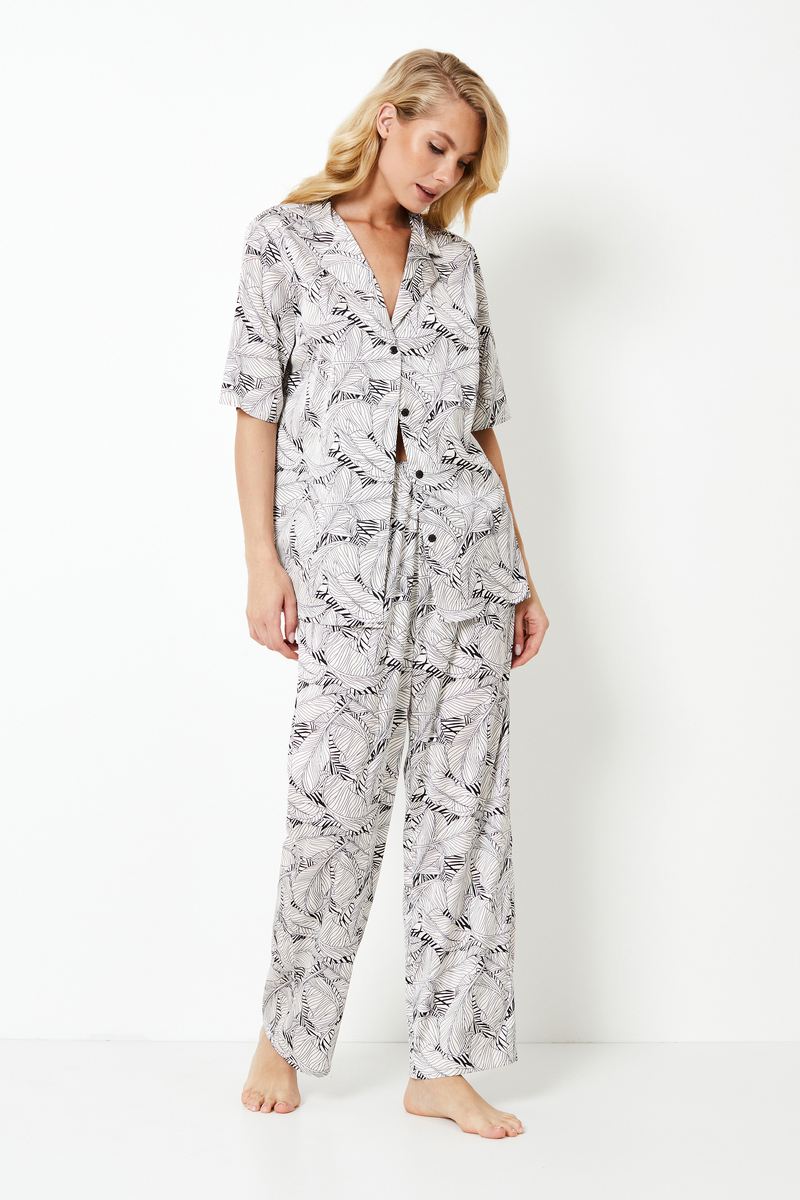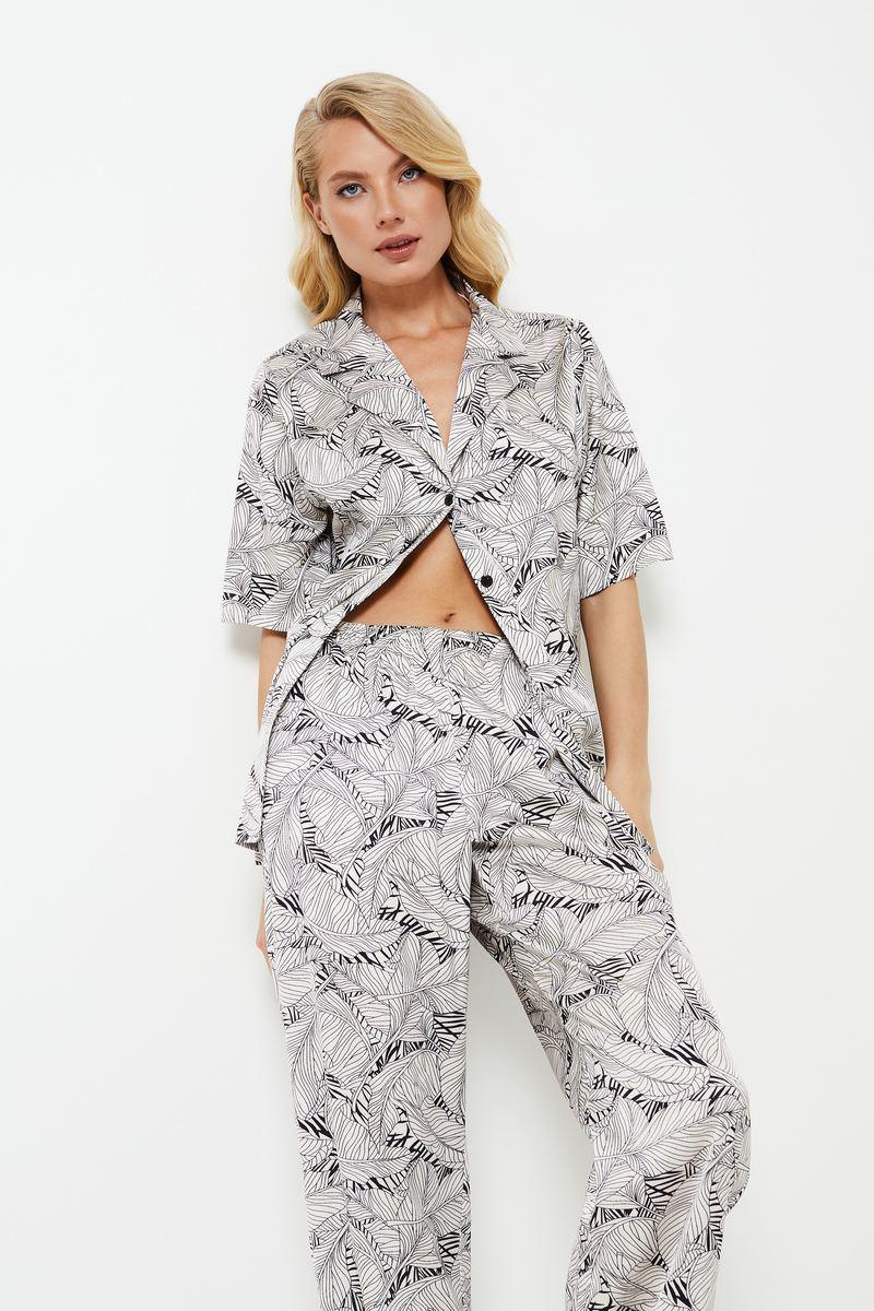 Коллекция Klaudie предлагает гармоничное сочетание комфорта и шикарного дизайна, что делает ее идеальным выбором для роскошного ночного сна. Рубашка на пуговицах с короткими рукавами, выполнена из полиэстера с шелковистой отделкой, имеет v-образный вырез с воротником, украшенный светло-черным рисунком в виде листьев на теплом белом фоне. Дополняют рубашку струящиеся брюки в тон, завязывающиеся на талии регулируемым бантом.