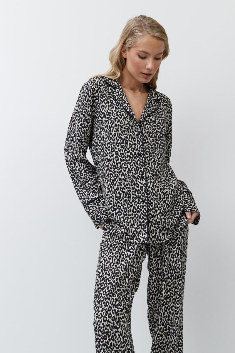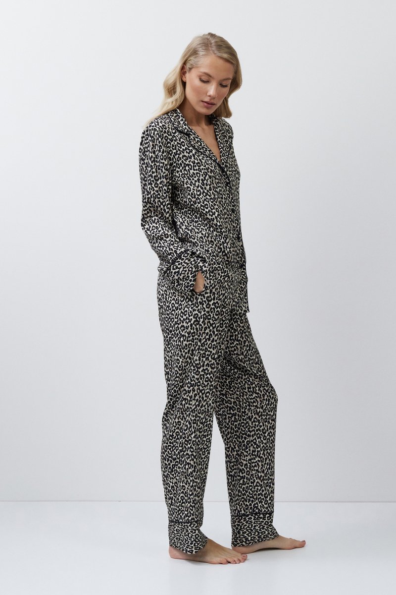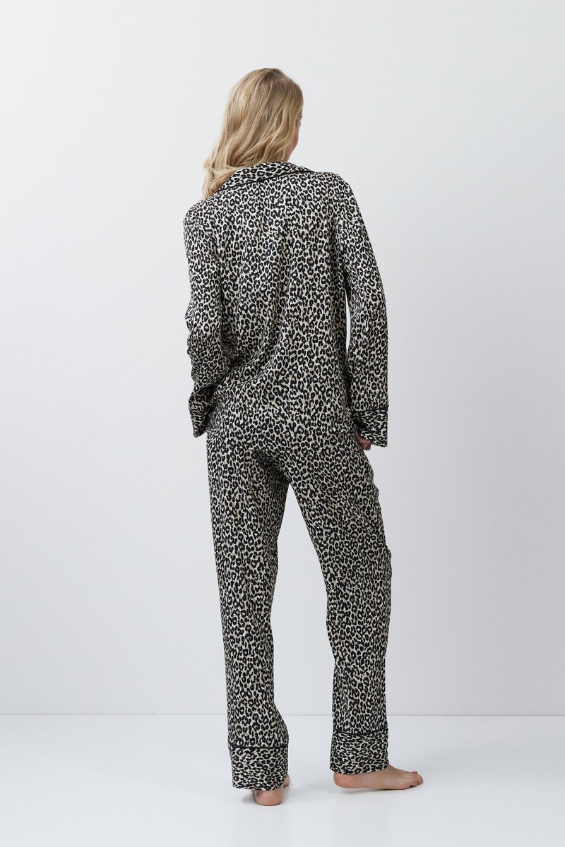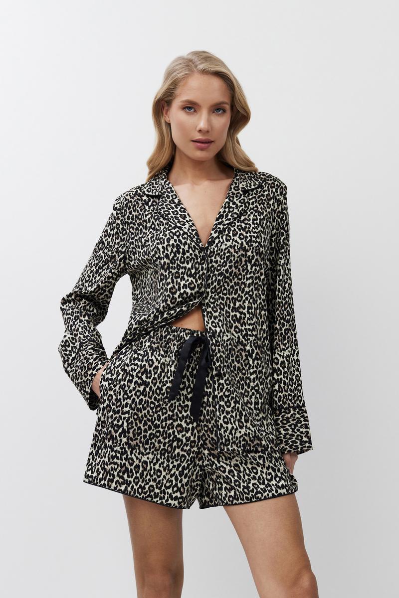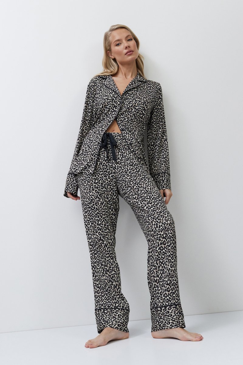 Пижама женская со штанами LEONA для вашего ночного комфорта. Пижама выполнена из вискозы с легким эластаном, с животным принтом. Рубашка на пуговицах, с длинными рукавами и отложным воротником. Окантовка дополняет и украшает комплект. Штаны свободные, с эластичным поясом с завязкой. Расслабьтесь с максимальным комфортом и стилем в пижаме LEONA.