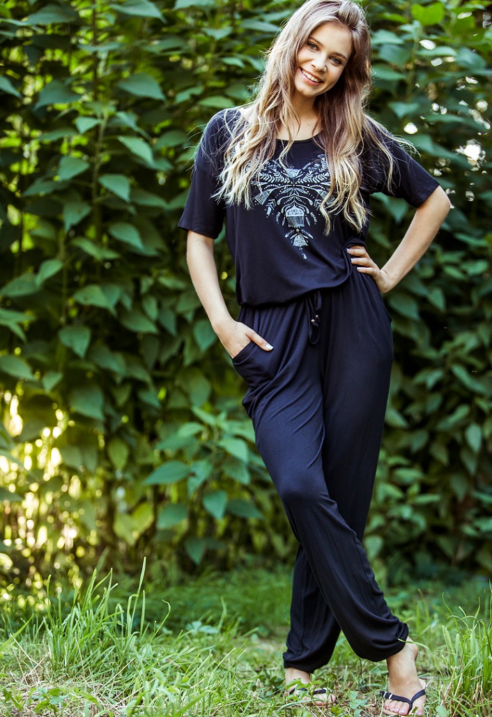 Комбинезон женский LHJ 841 от европейского производителя KEY. Длинный комбинезон с заниженной линией плеча, с коротким рукавом, декольте лодочкой и разрезом на спине. Удобная резинка на поясе и завязки с декоративными бусинами. Брюки-шаровары с мягкой резинкой на конце штанины.