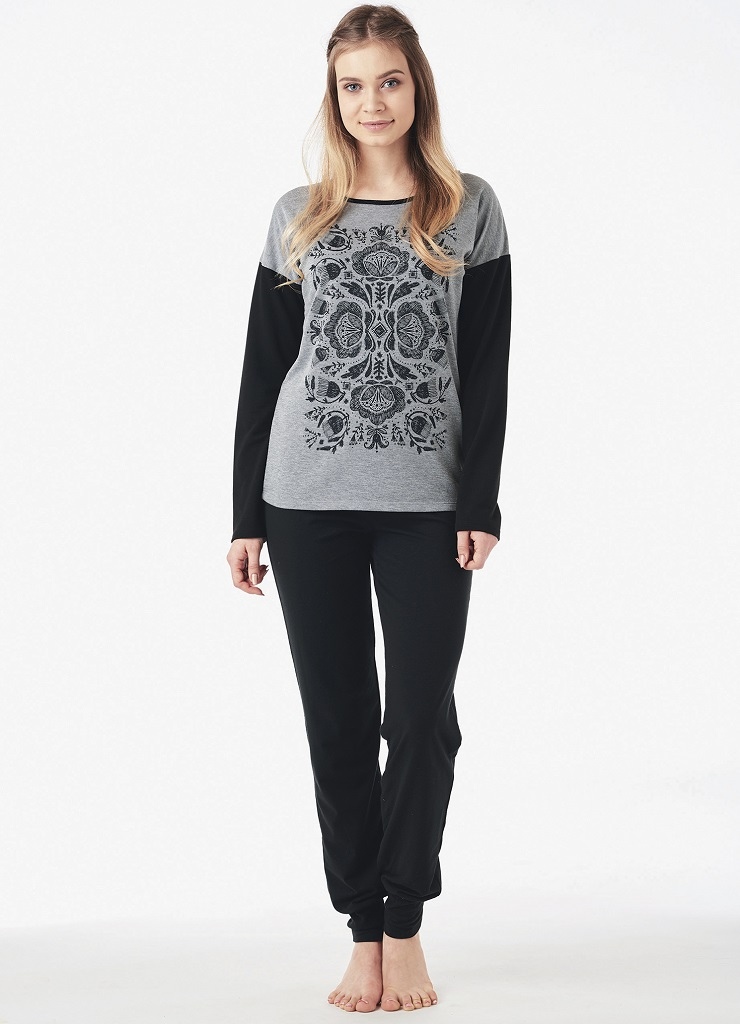 Костюм женский для дома и отдыха LHS 570 18/19. Комплект из мягкого и теплого вискозного трикотажа. Кофта свободного кроя с приспущенными длинными рукавами. Переднюю часть кофты украшает уникальный искусный принт. Брюки с карманами, понизу манжетная резинка. Состав: кофта - 65% полиэстер, 30% вискоза, 5% эластан; брюки - 95% хлопок, 5% эластан.