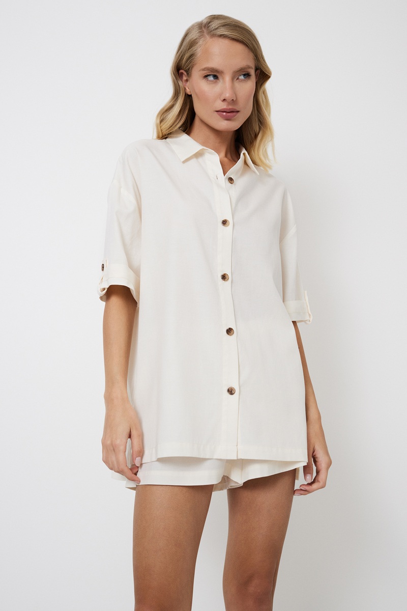 Представляем вам комплект Lorraine — шикарный ансамбль, созданный для того, чтобы сделать ваш отдых на побережье более комфортным и стильным. Он изготовлен из хлопковой ткани с вискозой и с добавлением тенселя, приятно прилегает к коже, а спокойный однотонный цвет излучает неподвластную времени элегантность. Топ на пуговицах с короткими рукавами, украшенный классическим воротником и стильными подвернутыми рукавами, придаст вашему гардеробу непринужденную изысканность. Шорты с эластичным поясом и разрезами по бокам. Этот ансамбль обеспечивает свободу движений. Независимо от того, наслаждаетесь ли вы уютным днём дома или греетесь на солнце на берегу, комплект Lorraine обеспечит вам комфорт.