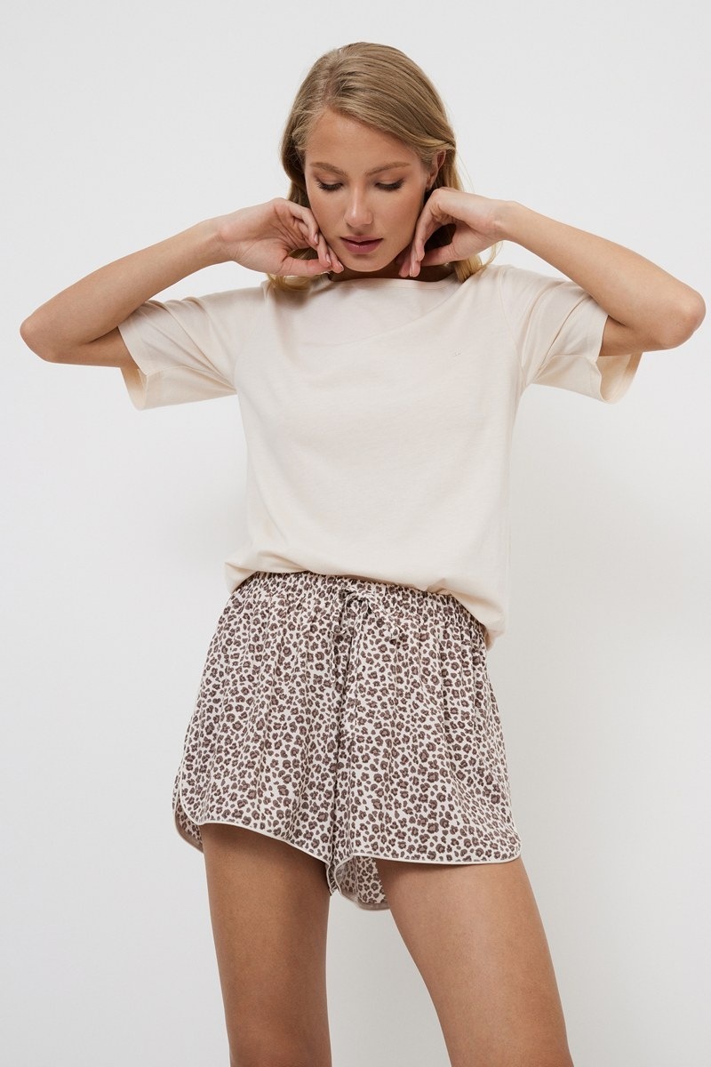 Представляем вашему вниманию неотразимую короткую пижаму с шортами Lummy — незаменимое дополнение к вашей коллекции ночного белья. Почувствуйте идеальное сочетание комфорта и стиля в пижаме, сшитой из роскошной хлопково-модальной смеси. Футболка с короткими рукавами имеет свободный, но привлекательный крой. Очаровательная вышивка в виде короны изящно украшает правую сторону груди, придавая царственную элегантность. Шорты с закруглёнными краями, изготовленными из лёгкой вискозы, с удобным поясом и игривыми деталями из тесьмы. Этот комплект создан как для отдыха, так и для стиля. В очаровательном пудровом цвете с леопардовым принтом. Побалуйте себя пижамой Lummy и поднимите свой отдых на новый уровень комфорта и изысканности. Состав: футболка 50% хлопок, 50% модал; шорты 100% вискоза.