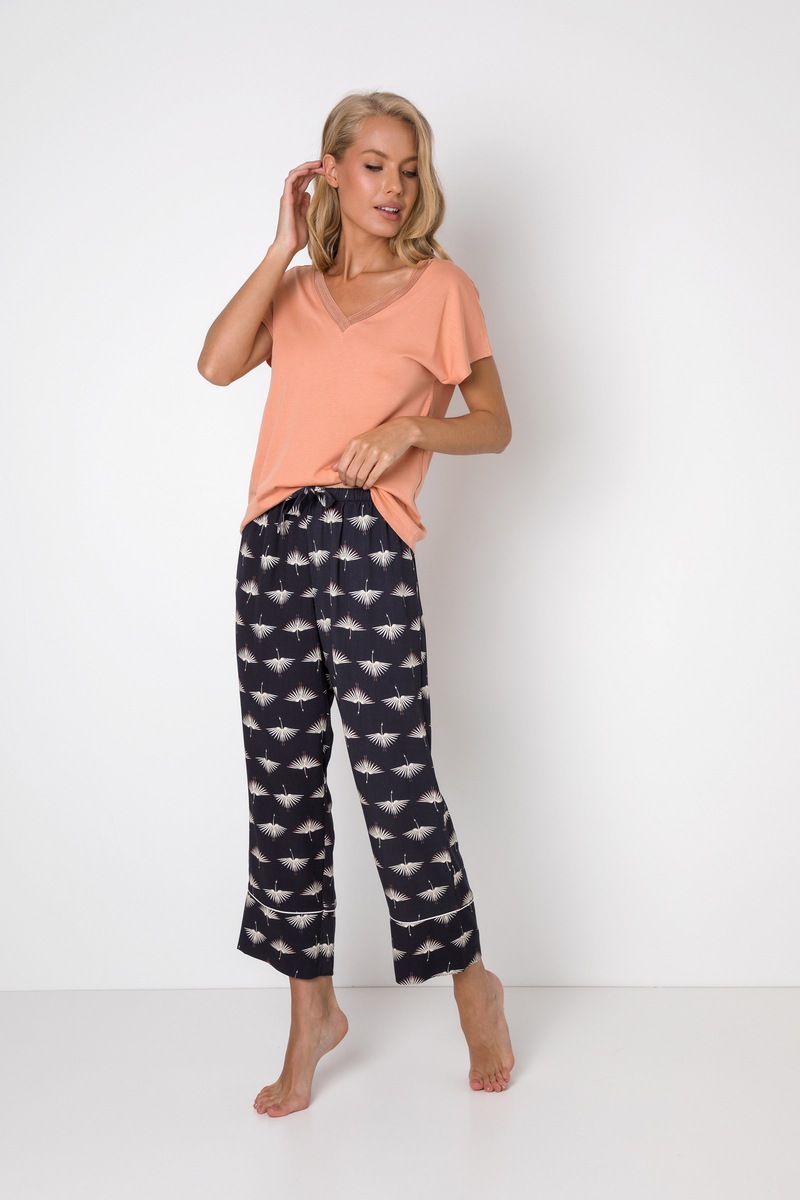 Добавьте дополнительную радость ночи с этим пижамным комплектом Moira. Топ изготовлен из сверхмягкой хлопчатобумажно-модальной ткани и имеет глубокий V-образный вырез с красивой кружевной отделкой спереди. В то время как брюки свободного покроя из саржевой вискозы длиной 7/8 имеют нижнюю окантовку, боковые карманы и эластичный пояс с регулируемым бантом на талии. Футболка: 50% хлопок, 50% модал Штаны: 100% вискоза