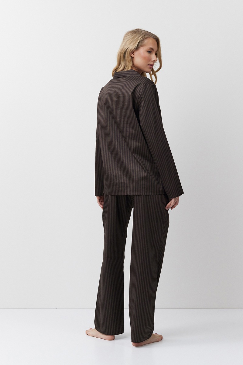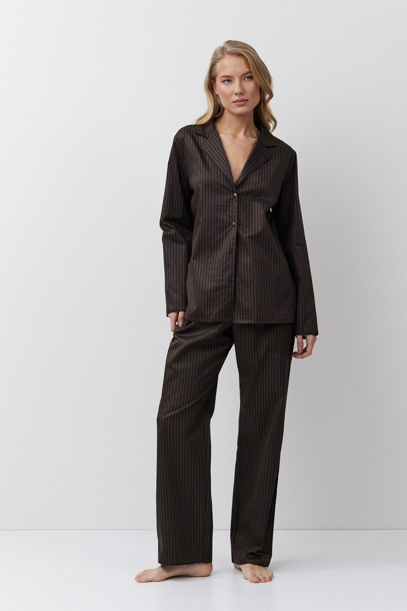 Пижама женская со штанами NOEMIE для вашего ночного комфорта. Пижама выполнена из текстильного хлопка в полоску с легким блеском. Рубашка на пуговицах, с длинными рукавами и отложным воротником. Окантовка по низу рукавов и штанов. Штаны прямого кроя, эластичный пояс украшен двумя пуговицами. По бокам карманы. Расслабьтесь с максимальным комфортом и стилем в пижаме NOEMIE.