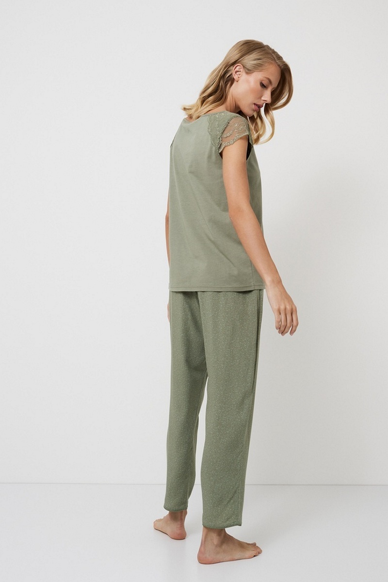Представляем вашему вниманию нашу очаровательную пижаму Odelia, в которой каждая деталь — восхитительный сюрприз, ожидающий своего открытия. Топ, сшитый из роскошной хлопково-модалной смеси в успокаивающем оливковом цвете. V-образный вырез и кружевные короткие рукава придают ему женственное очарование. Брюки длиной до щиколотки, сшитые из мягкой вискозы, дополнены регулируемым поясом-бантом и зелёной окантовкой. Они украшены очаровательным приглушённым абстрактным узором, который дополняет кружевные детали топа. Погрузитесь в очарование пижамы Odelia и испытайте новые ощущения от домашней одежды. Состав: футболка 50% хлопок, 50% модал; шорты 100% вискоза.