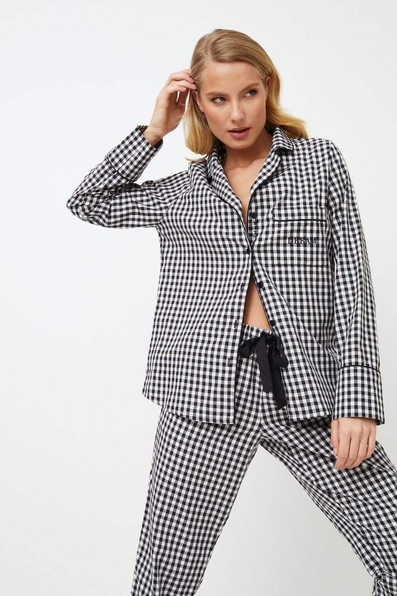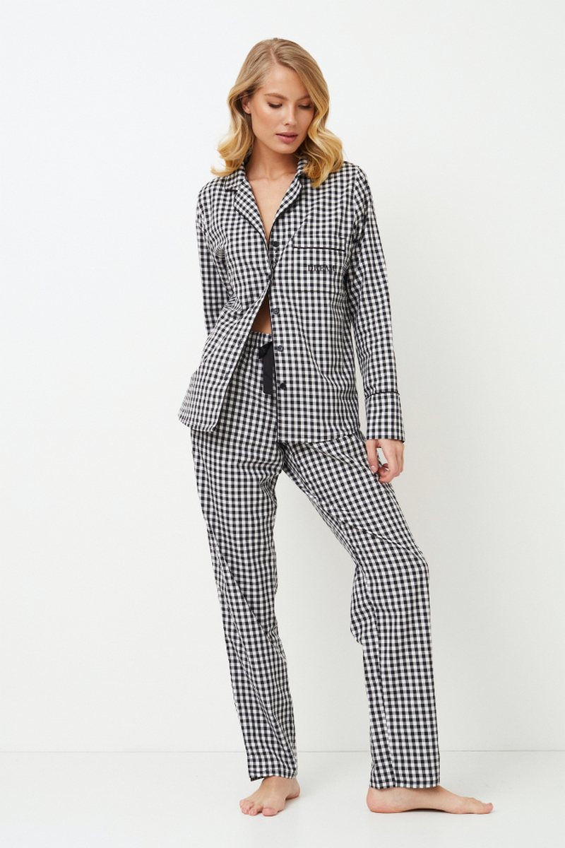 Откройте для себя элегантность, неподвластную времени, с пижамой Philippa long. В сочетании черных и белых оттенков в клетку вы почувствуете спокойствие и гармонию, которые приведут вас к спокойному сну. Рубашка с длинными рукавами, v-образным вырезом горловины и карманом, украшенным вышивкой "Мечта", а также застегивающийся на пуговицы топ с потайной вышивкой "со мной" между пуговицами, добавляющей оригинальности вашему образу перед сном. Рубашка украшена тонким черным кантом, который дополняется черной поясной лентой на брюках, придающей образу элегантность и стиль. Не оставляйте без внимания свою вторую половинку: они могут присоединиться к уютному веселью в пижаме Philip pajama long, пока вы будете качаться в пижаме Philippa pajama long. Это идеальное сочетание для стильного и уютного вечера — просто не забудьте разделить с ней комфорт! Ткань хлопок текстильный.
