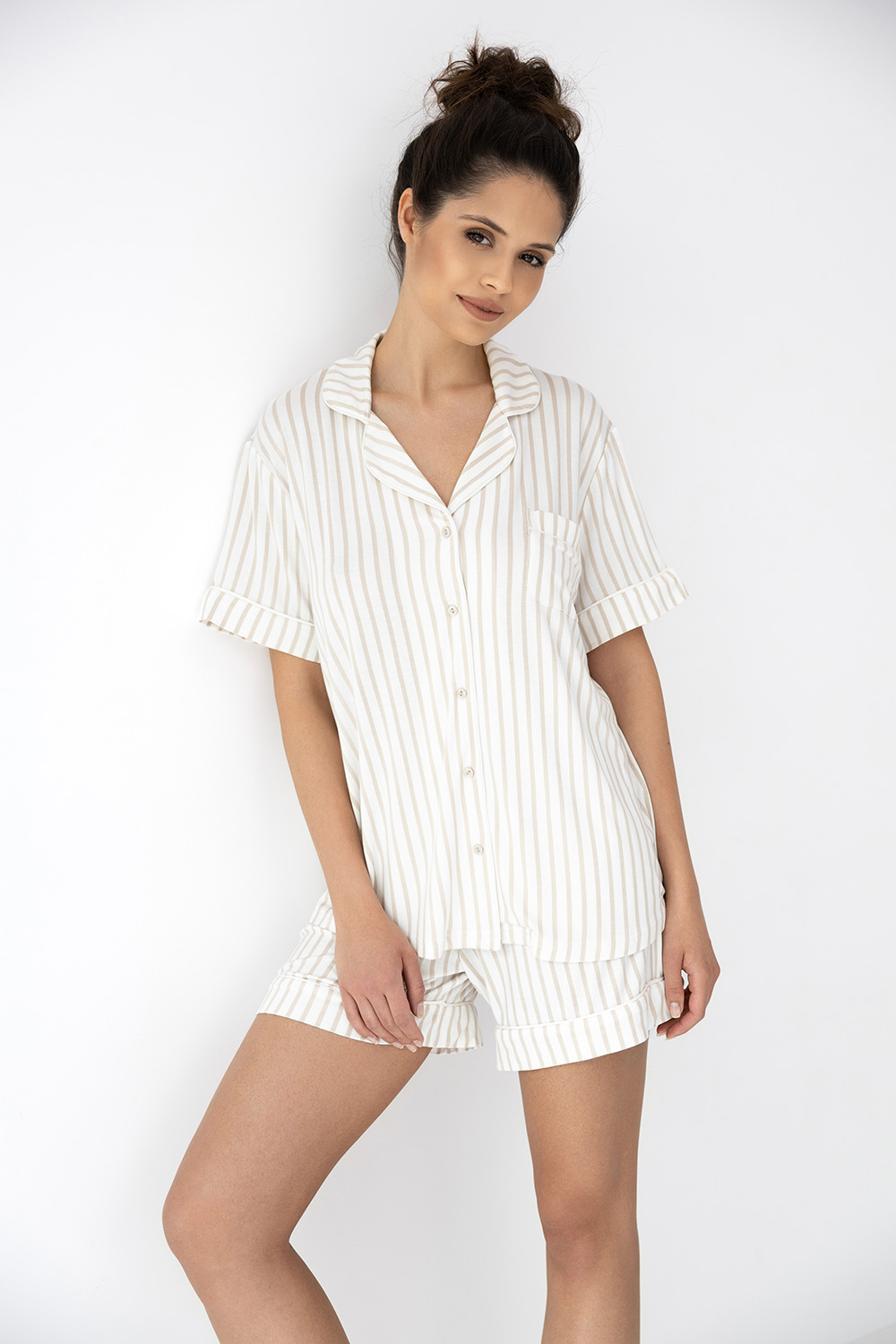 Классический домашний комплект Davina состоит из рубашки и шорт в полоску. Рубашка на пуговицах, оформлена фигурным воротником. Идеальный вариант не только для сна, но и для домашнего отдыха.