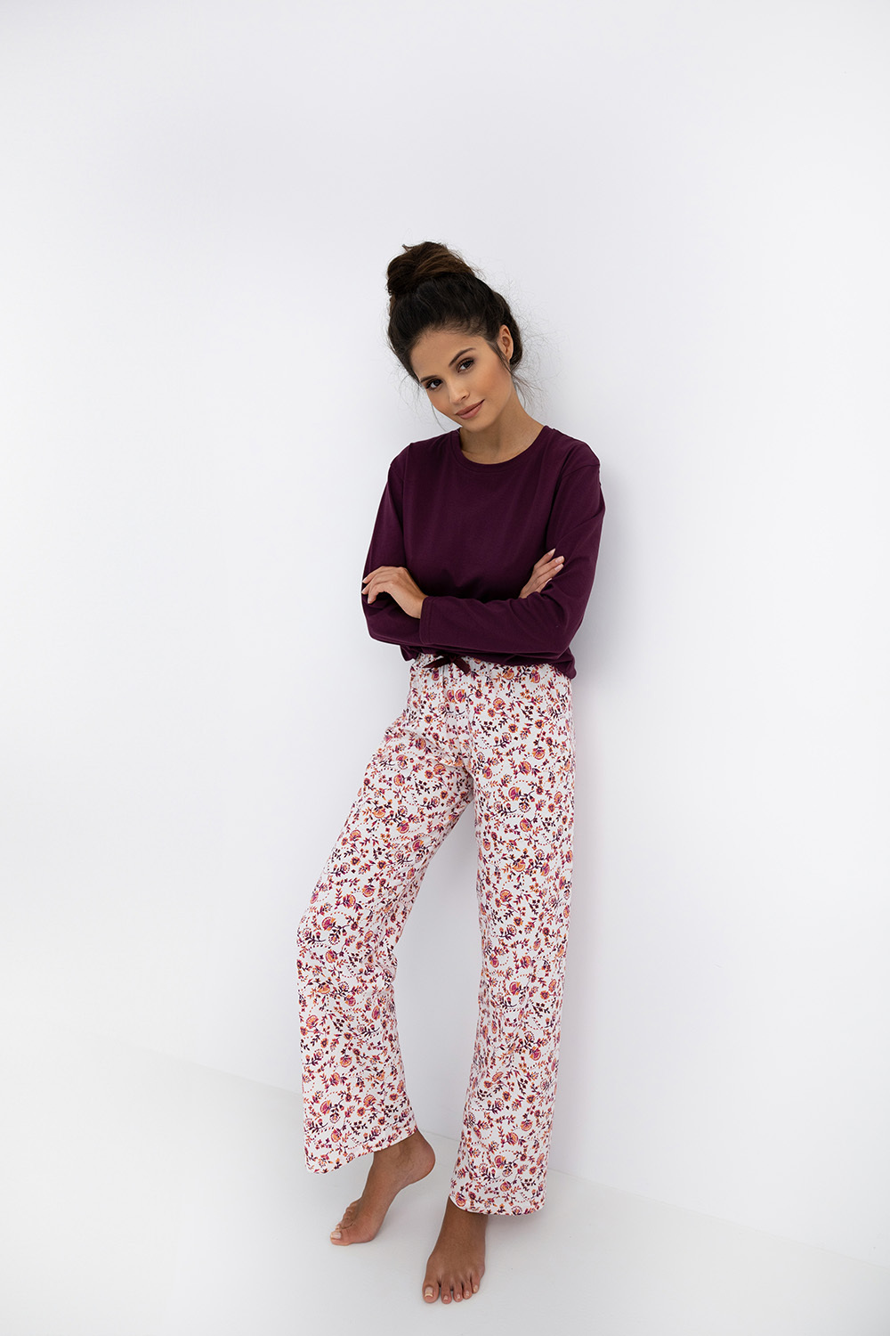 Пижама Heidi состоит из прямых брюк белого цвета с цветочным принтом и однотонного лонгслива с длинными рукавами. Брюки на широкой резинке, декорированы контрастным бантиком. Идеальный вариант не только для сна, но и для домашнего отдыха.