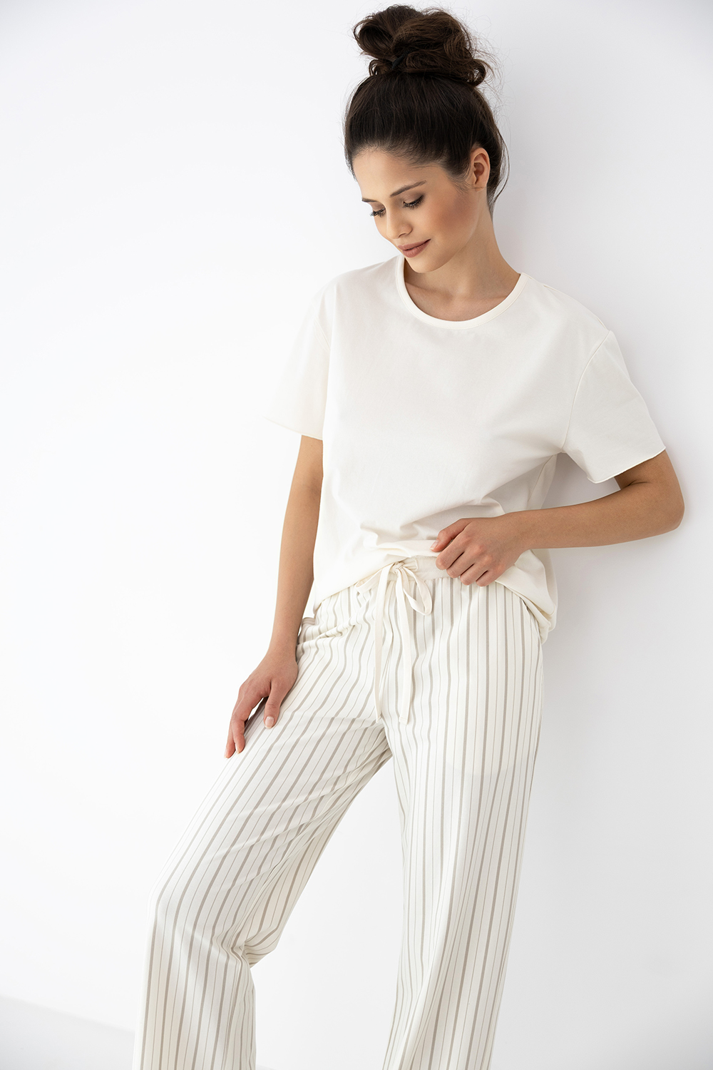 Домашний комплект Simona состоит из футболки и брюк в полоску. Футболка однотонная прямого кроя. Идеальный вариант не только для домашнего отдыха, но и для прогулки.