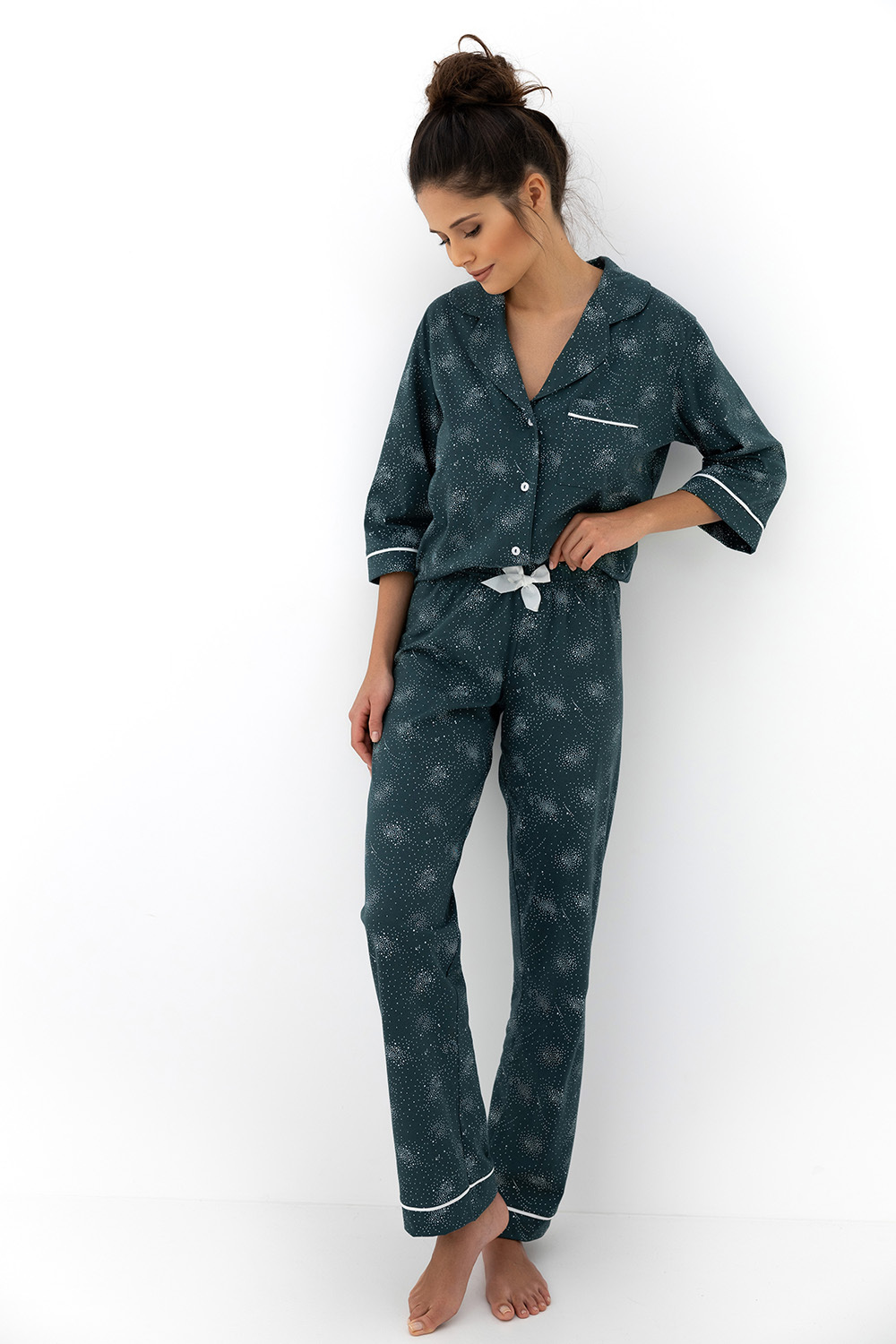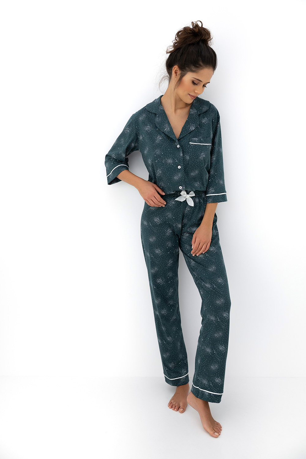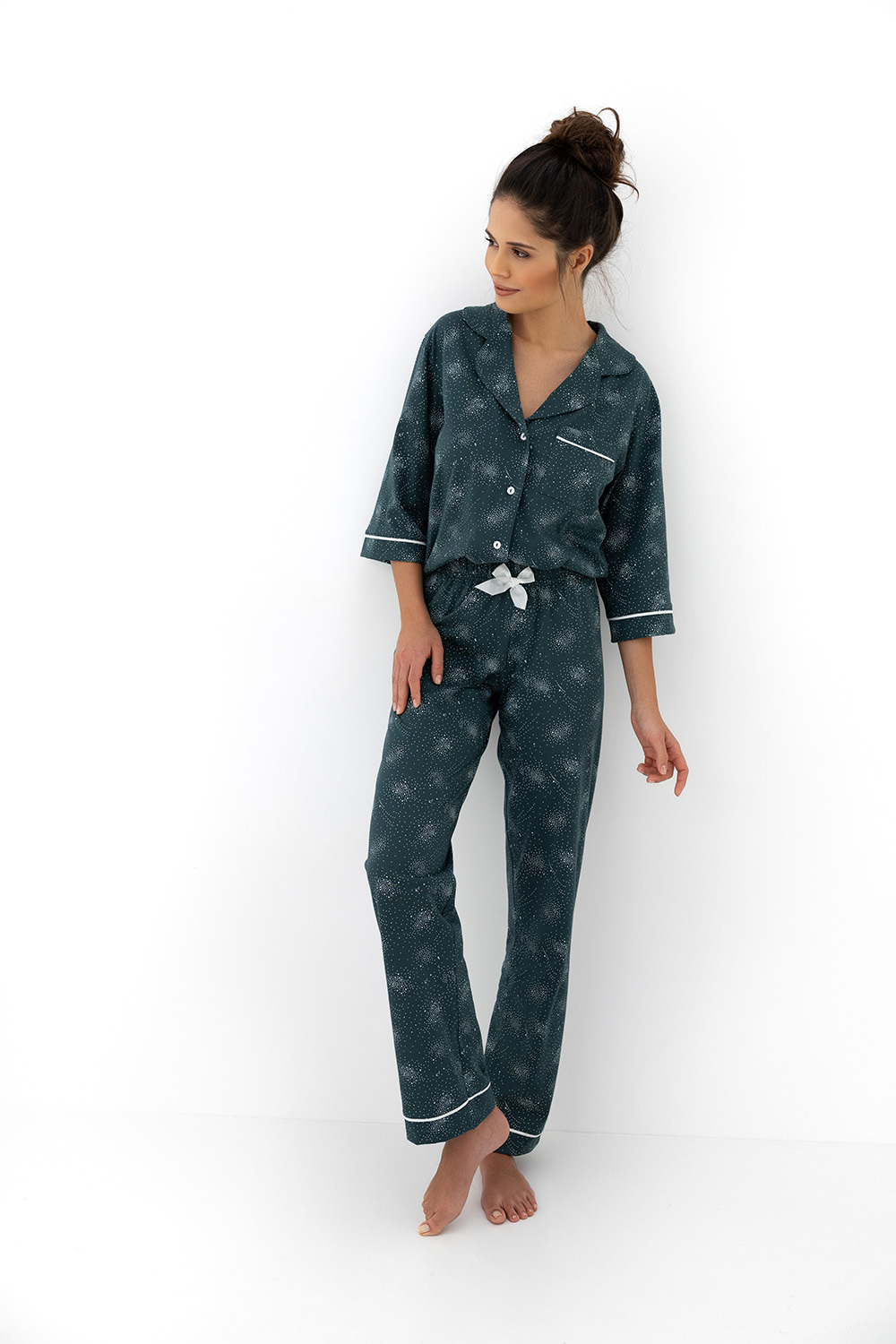 Повседневная пижама Sydney темно-синего цвета состоит из рубашки и прямых брюк. Рубашка на пуговицах, с фигурным воротником и рукавами 3/4. На груди накладной карман. Идеальный вариант не только для сна, но и для домашнего отдыха.