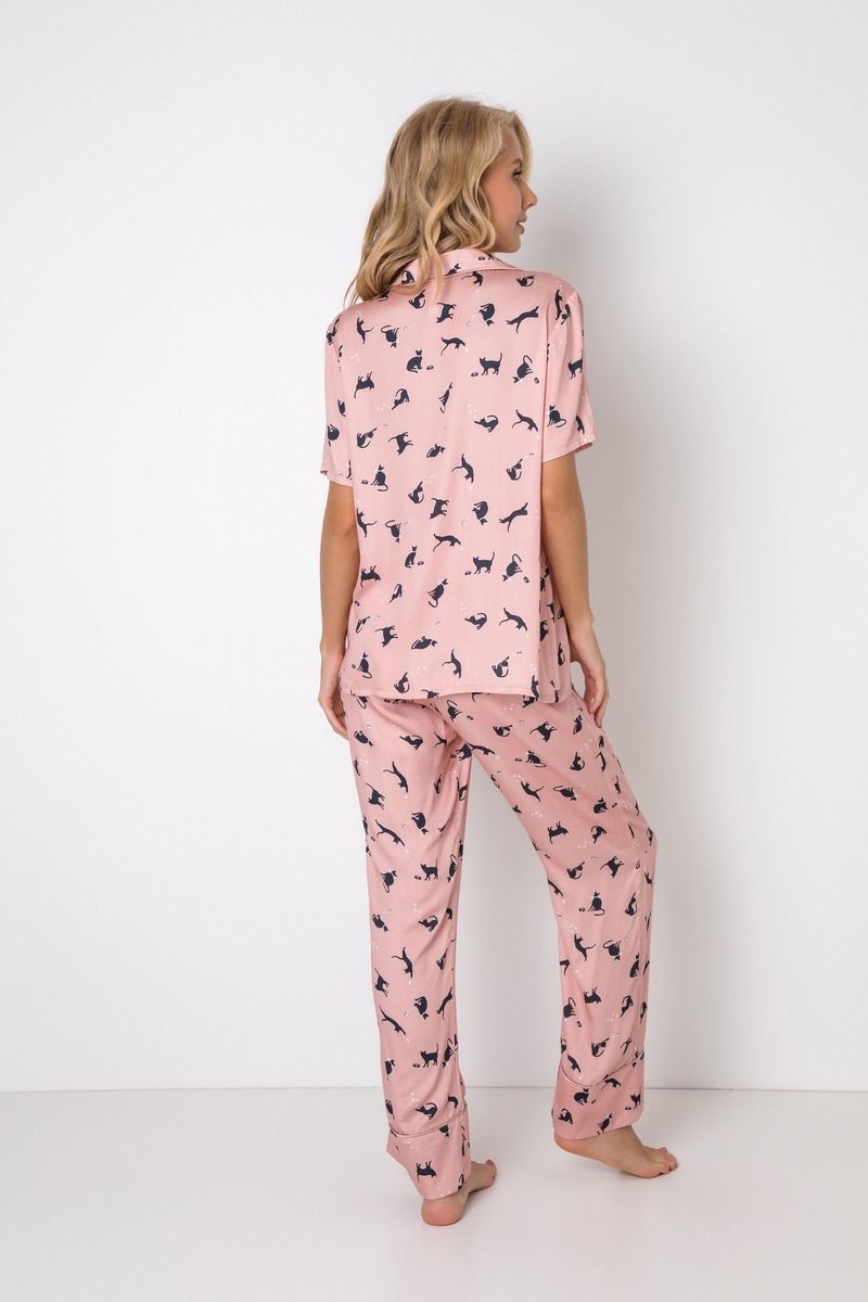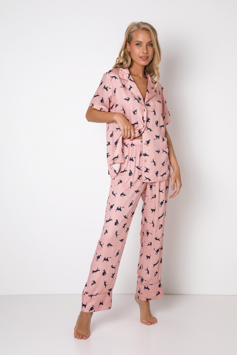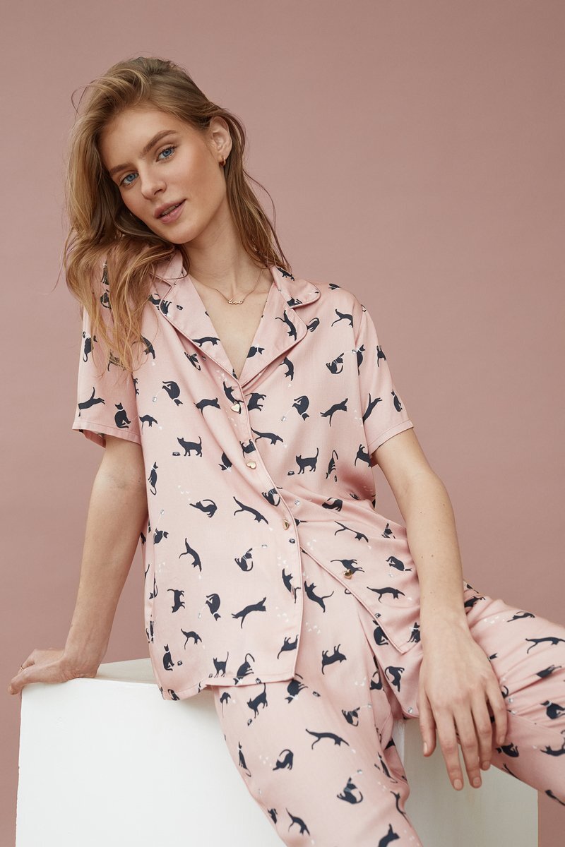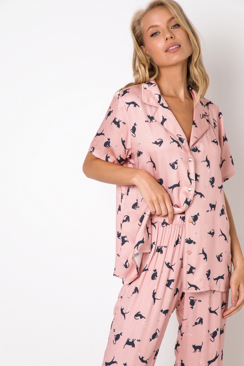 Добавьте немного веселья перед сном с помощью этого пижамного комплекта из вискозы с игривым принтом в виде кошек по всему телу. Рубашка с коротким рукавом на пуговицах украшена розовым кантом на воротнике и элегантными золотыми пуговицами в виде сердечек. Свободные пижамные брюки украшены атласным кантом по низу и имеют эластичный пояс. Изделие изготовлено из супер мягкой, деликатной вискозной ткани с добавлением шелковой нити, которая исключительно нежна для вашей кожи! ВНИМАНИЕ, из-за деликатности ткани - не отпаривать! Гладить утюгом без пара!