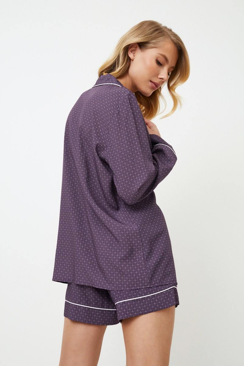 Представляем короткую пижаму Sabine - в каждом шве чувствуется нотка королевского удовольствия. Эта рубашка с длинными рукавами, V-образным вырезом горловины, нагрудным карманом и элегантными манжетами на рукавах, украшенными белой окантовкой, придаст вам комфорт. В сочетании с широкими шортами с удобными карманами и окантовкой по низу. Шорты дополнены поясом-шнурком с металлической деталью. Пижамный комплект из вискозы королевского фиолетового цвета с геометрическим рисунком. Почувствуйте королевский комфорт в короткой пижаме Sabine.