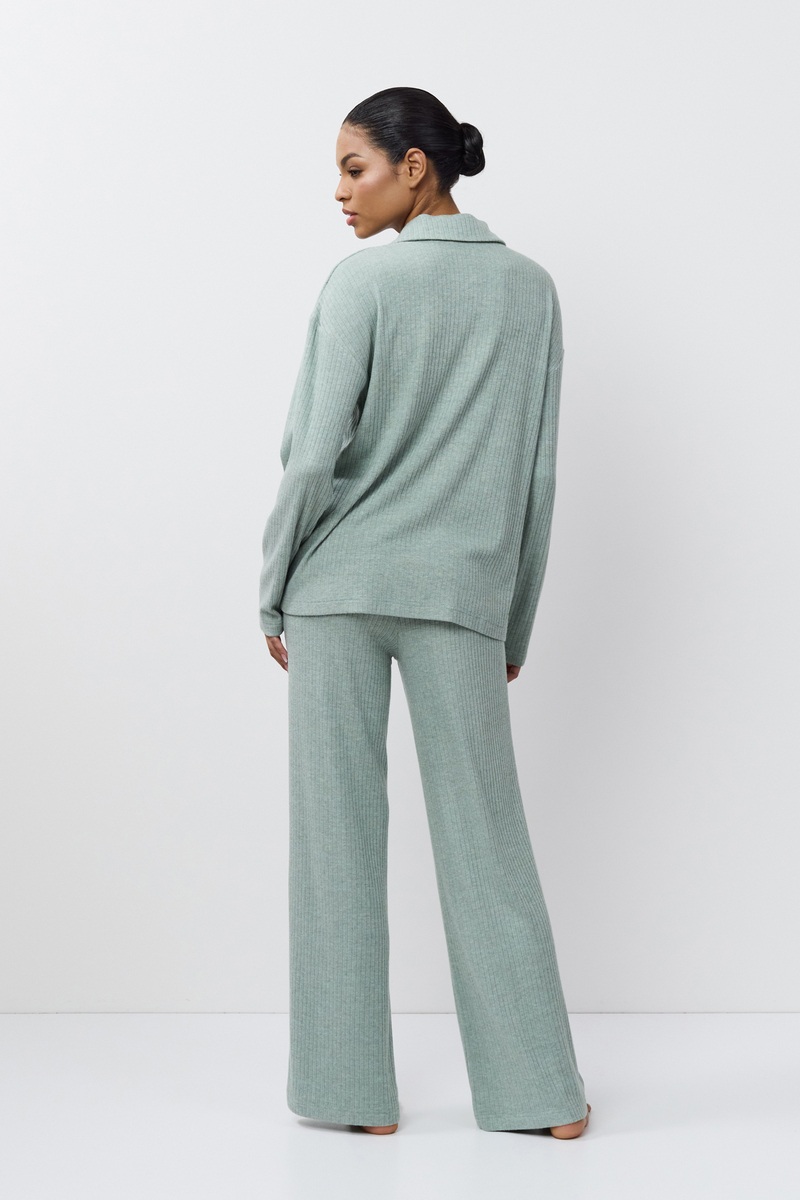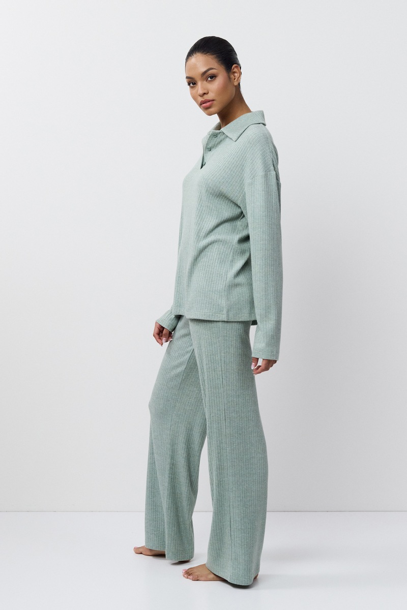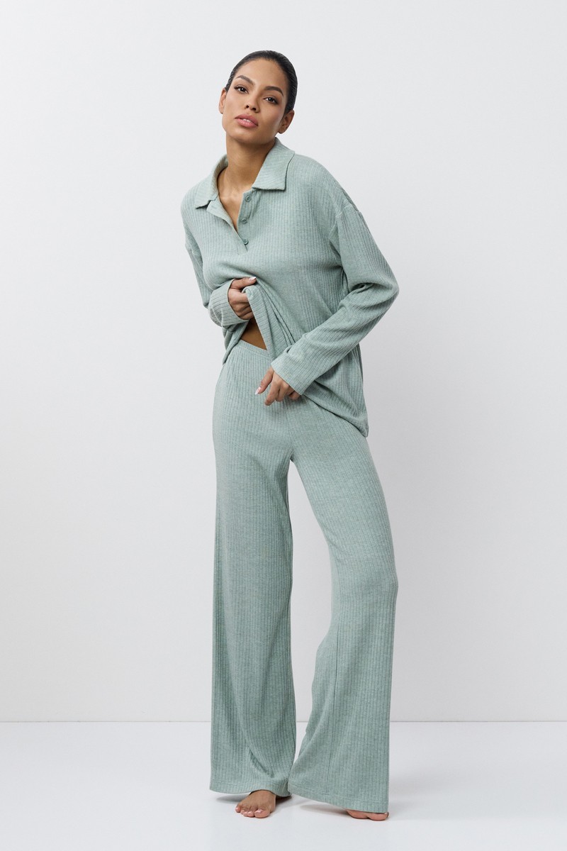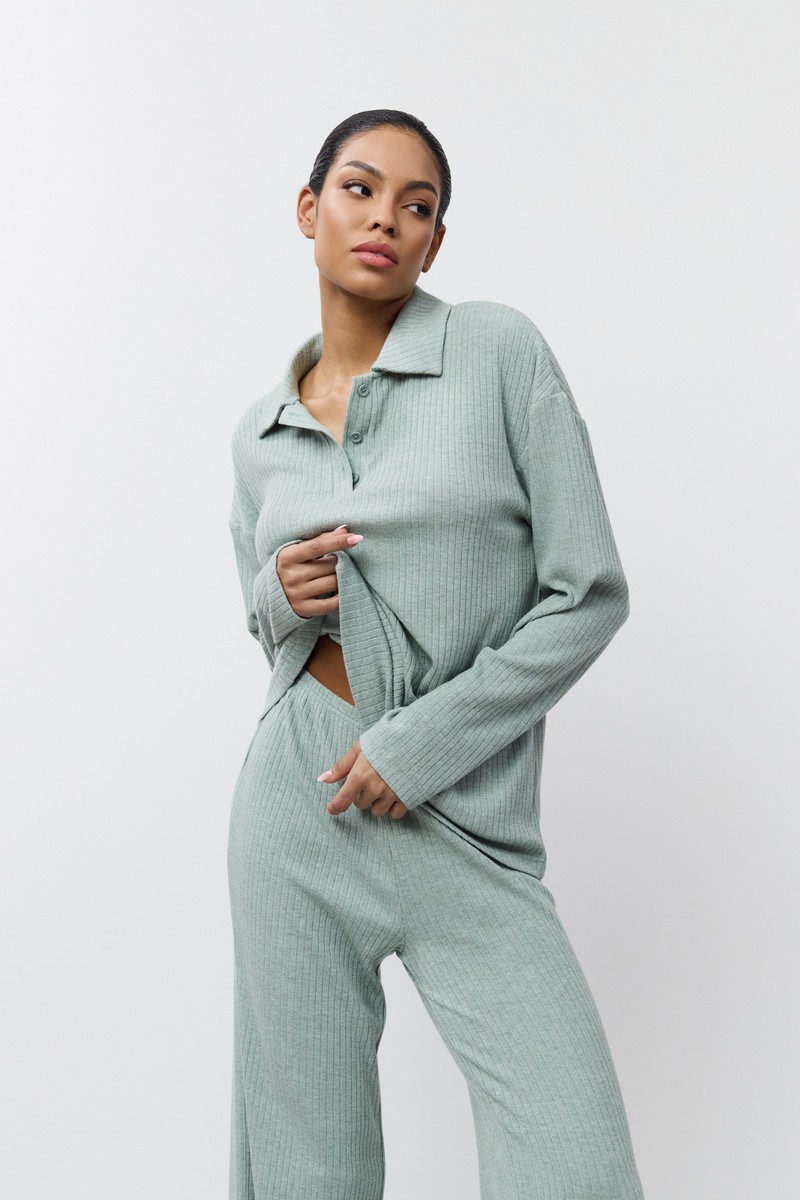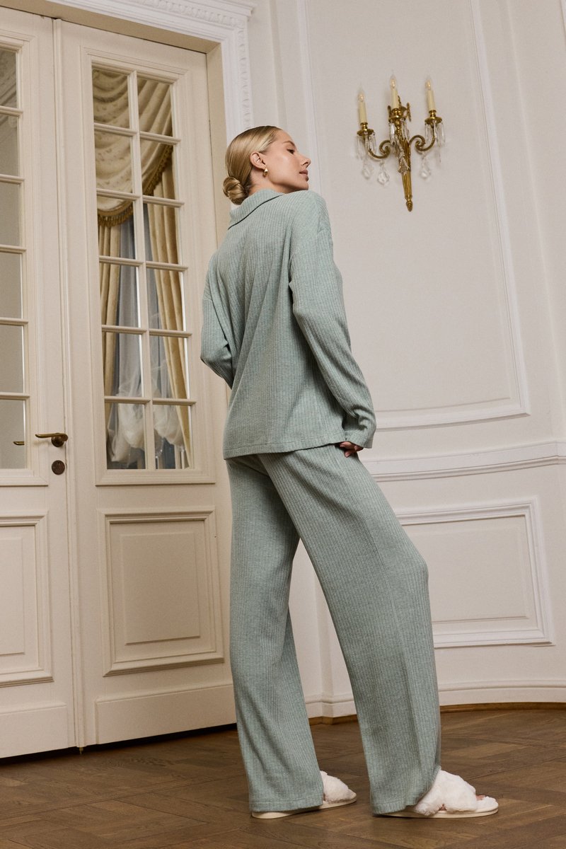 Комплект женский со штанами SAIGE SET подарит вам уют. Изготовлен из вискозы, текстура в рубчик, ткань приятная для тела. Лонгслив с длинными рукавами, воротник отложной с планкой на пуговицах. Штаны длинные, комфортной посадки, свободные, пояс на эластичной резинке. Комплект станет вашим идеальным спутником в моменты расслабления.