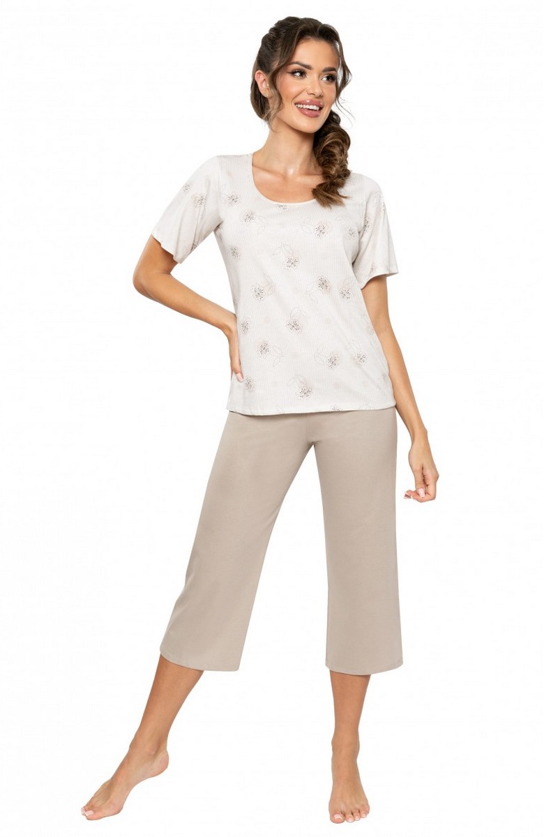 Хлопковая пижама SANDI 3/4 от европейского производителя Donna. Комплект состоит из футболки и капри. Однотонные капри на резинке, свободного кроя. Футболка в рубчик с мягким принтом бежевых оттенков, слегка удлиненный рукав, идеально скрывающий возможные недостатки. На сайте указан европейский размер! К европейскому размеру +6.