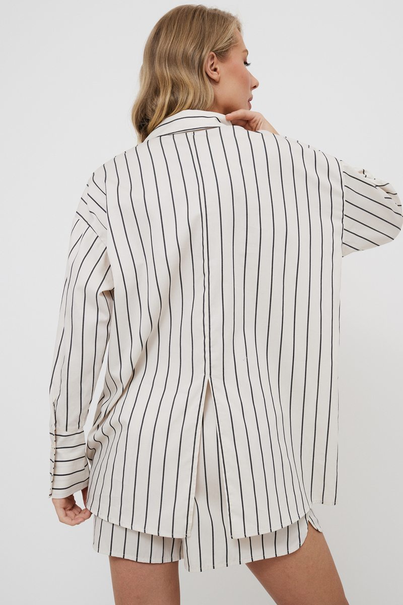 Представляем вам комплект Seraphine, гармоничное сочетание комфорта и стиля. Пижама выполнена из лёгкой хлопковой ткани с полосками, что придаёт ей очарование. Рубашка на пуговицах с длинными рукавами имеет классический воротник и закруглённый низ, высокие манжеты на рукавах и небольшую прорезь на спине, что придаёт ей лёгкое очарование. В сочетании с широкими шортами с завышенной талией, закруглёнными углами, эластичным поясом на завязках и удобными карманами этот комплект выглядит стильно и комфортно. Независимо от того, отдыхаете ли вы дома или прогуливаетесь по городским улицам, комплект Seraphine обеспечит вам неоспоримый стиль и непревзойденный комфорт.