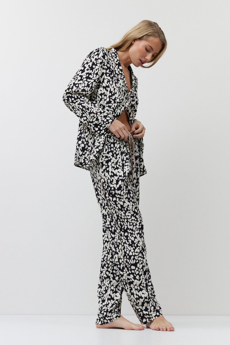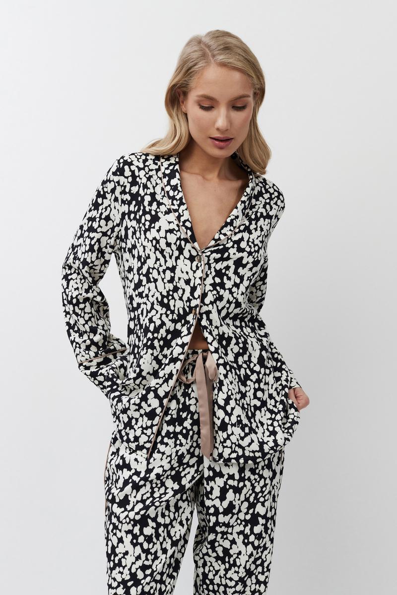 Пижама женская со штанами SOLENE для вашего ночного комфорта. Пижама выполнена из вискозы. Рубашка на пуговицах, с длинными рукавами, отложным воротником. Окантовка дополняет и украшает комплект. Штаны свободные, с эластичным поясом с завязкой. Расслабьтесь с максимальным комфортом и стилем в пижаме SOLENE.