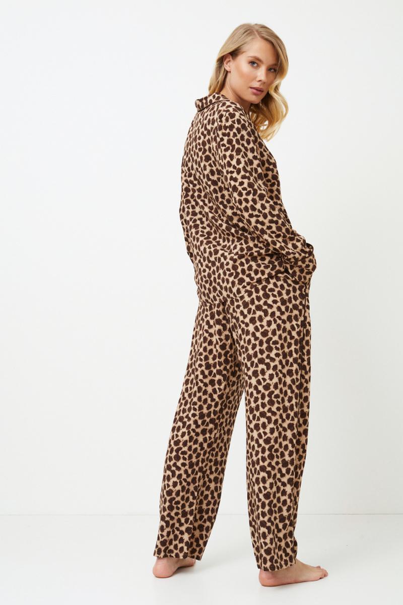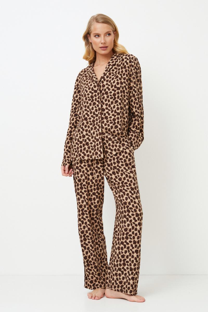 Представляем вашему вниманию длинную пижаму Susan с ярким леопардовым принтом, который внесет изюминку в ваш повседневный образ. Этот комплект выполнен из дышащей вискозы с эффектным леопардовым принтом. Топ с длинными рукавами, застегивающийся на пуговицы, и V-образным вырезом горловины. Длинные брюки в тон имеют карманы и украшены коричневой окантовкой по бокам. Наденьте длинную пижаму Susan и позвольте удобной ткани и увлекательному дизайну унести вас в мир романтики и расслабления. Ткань - вискоза.