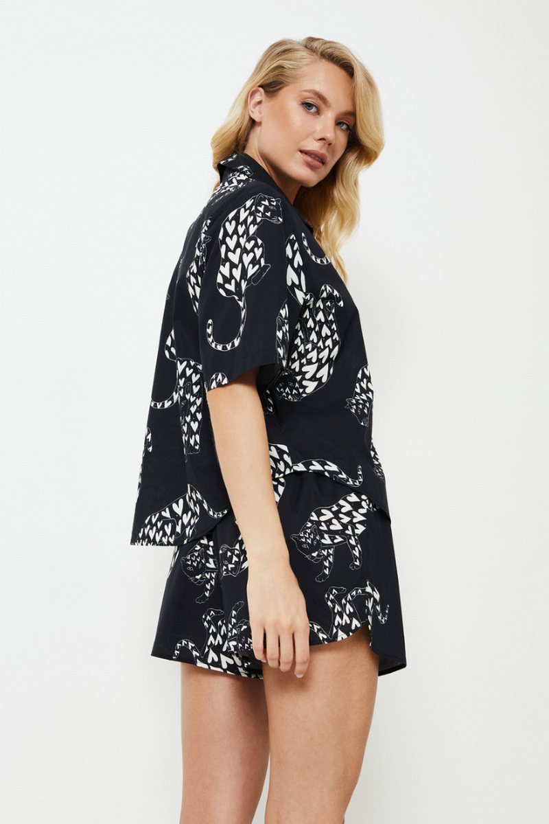 Tamisha предлагает восхитительное сочетание игривого стиля и роскошного комфорта. Пижама изготовлена из дышащей хлопчатобумажной ткани с черно-белым принтом в виде гепарда в виде сердца. Укороченная рубашка с коротким рукавом и воротником на пуговицах имеет уникальную форму с закругленными краями внизу, что придает ей нотку шика. Идеально сочетается с шортами с регулируемыми завязками на талии, повторяющими яркий узор.