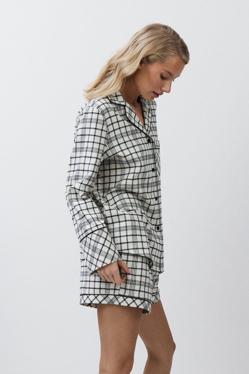 Пижама женская с шортами TERRA для вашего ночного комфорта. Пижама изготовлена из фланелевого хлопка с принтом в клетку. Рубашка на пуговицах, с длинными рукавами, отложным воротником и нагрудным карманом. Окантовка дополняет и украшает комплект. Шорты свободные, с эластичным поясом с завязкой. Расслабьтесь с максимальным комфортом и стилем в пижаме TERRA.