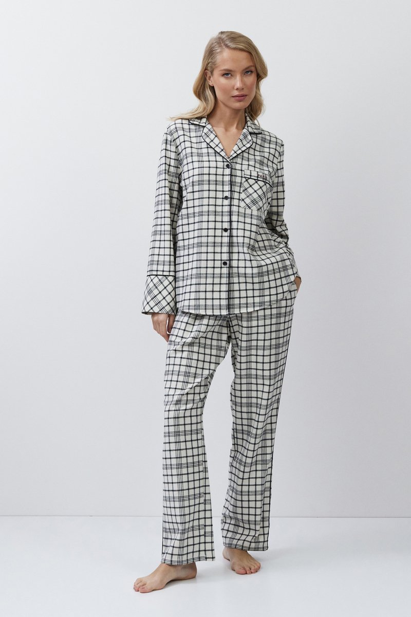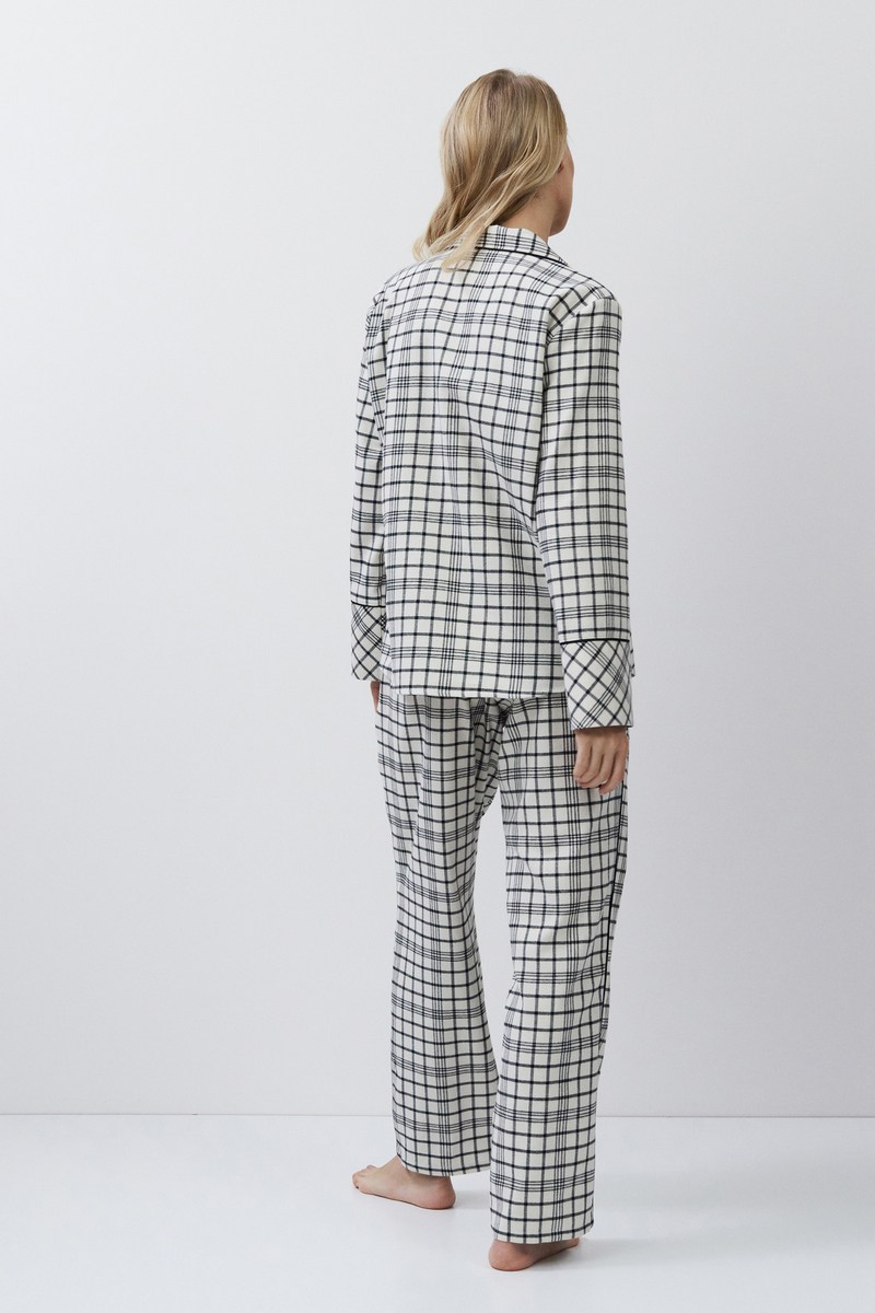 Пижама женская с шортами TERRA для вашего ночного комфорта. Пижама изготовлена из фланелевого хлопка с принтом в клетку. Рубашка на пуговицах, с длинными рукавами, отложным воротником и нагрудным карманом. Окантовка дополняет и украшает комплект. Шорты свободные, с эластичным поясом с завязкой. Расслабьтесь с максимальным комфортом и стилем в пижаме TERRA.