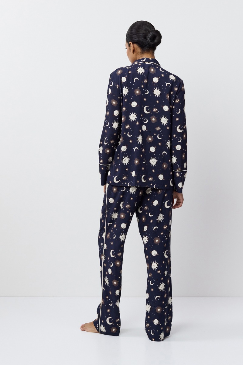 Пижама женская со штанами VENUS для максимального комфорта и расслабления. Выполнена из вискозы. Рубашка на пуговицах, с отложным воротником и нагрудным карманом, рукава длинные. Штаны длинные, свободные, комфортной посадки, по бокам карманы, пояс эластичный. Окантовка добавляет изысканности изделию. Пижама станет вашим идеальным спутником во время сна.