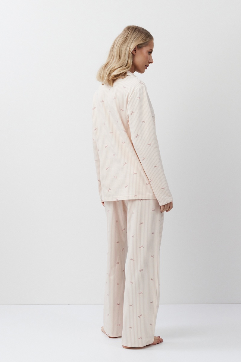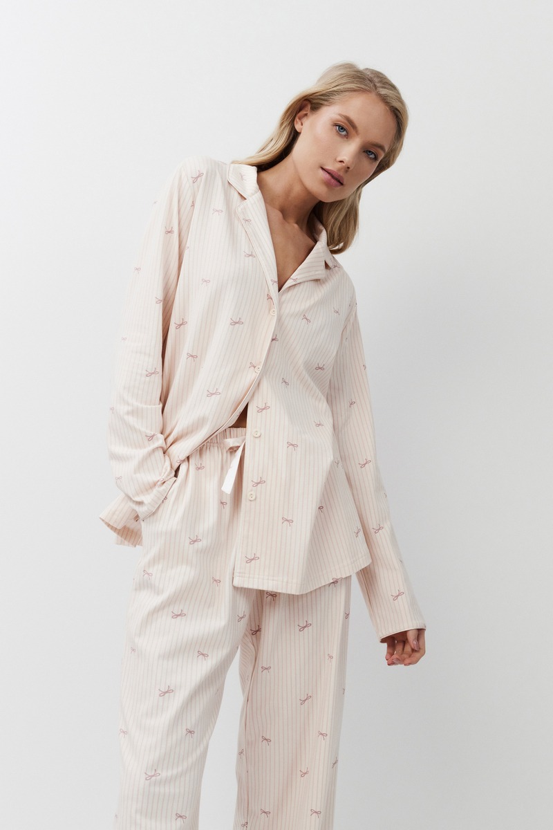 Пижама женская со штанами ROMIE для максимального комфорта и расслабления. Выполнена из приятной к телу мягкого модала с хлопком. Рубашка на пуговицах, с отложным воротником и V-образным вырезом. Рукава длинные. Штаны длинные, свободные, с комфортной посадкой, эластичный пояс со шнурком. Пижама станет вашим идеальным спутником во время сна.