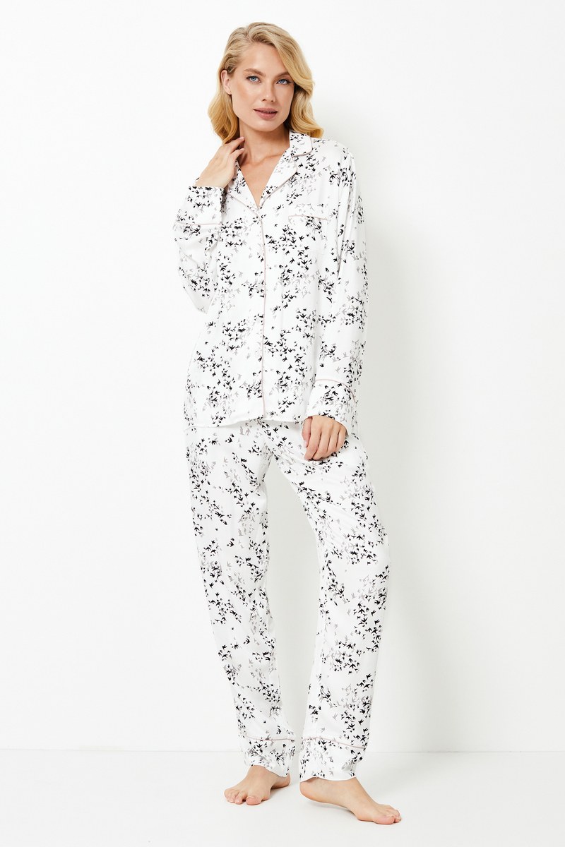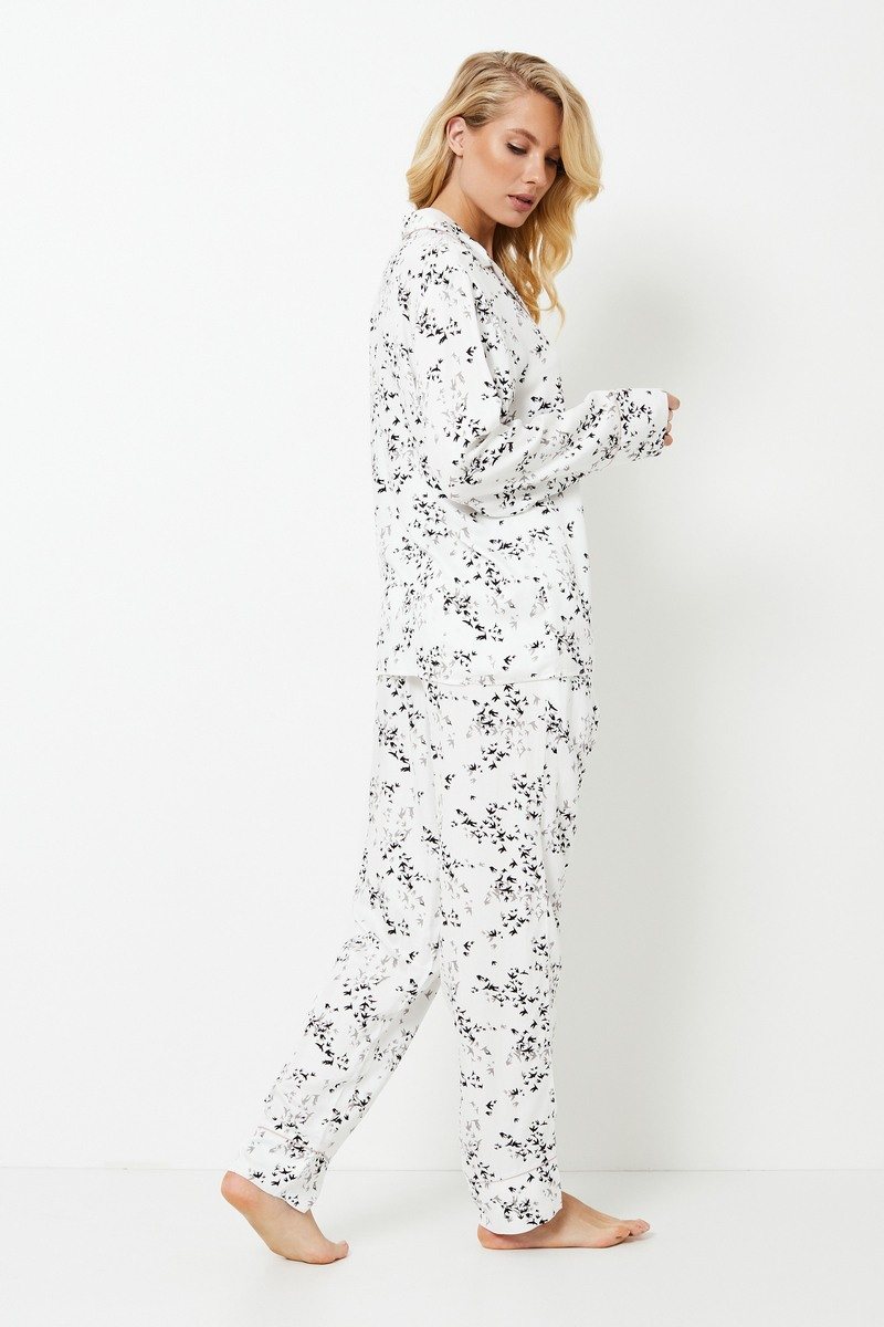 Коллекция Zillie представляет собой гармоничное сочетание изысканности и игривого очарования для стильного ночного сна. Комплект украшен светлым белым фоном с черными и серыми птицами. Топ на пуговицах с длинными рукавами, выполненный из мягкого и блестящего вискозного материала, может похвастаться v-образным воротником и шикарным нагрудным карманом с правой стороны. Украшен элегантной розовой окантовкой вдоль воротника, передней части, кармана и прострочки рукава. Сочетается с брюками классической формы с регулируемыми бантами на талии и кантом в тон по низу.