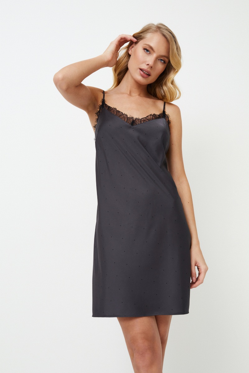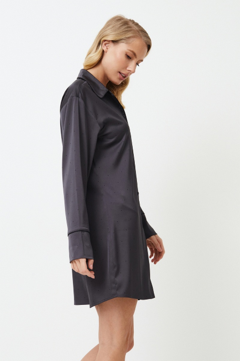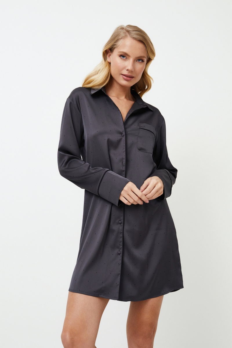Представляем ночную рубашку Agatha, темный и смелый выбор для тех, кто предпочитает минимализм. Платье с длинными рукавами застегивается спереди на пуговицы, имеет классический воротник и украшено черной окантовкой по краям. Ночная рубашка, сшитая из блестящей плотной темно-серой ткани в мелкий черный горошек, создает ауру элегантности и гламура, идеально подходящую для тех, кто любит выделяться даже в ночной тишине. Раскройте свою внутреннюю драму с ночной рубашкой Agatha.