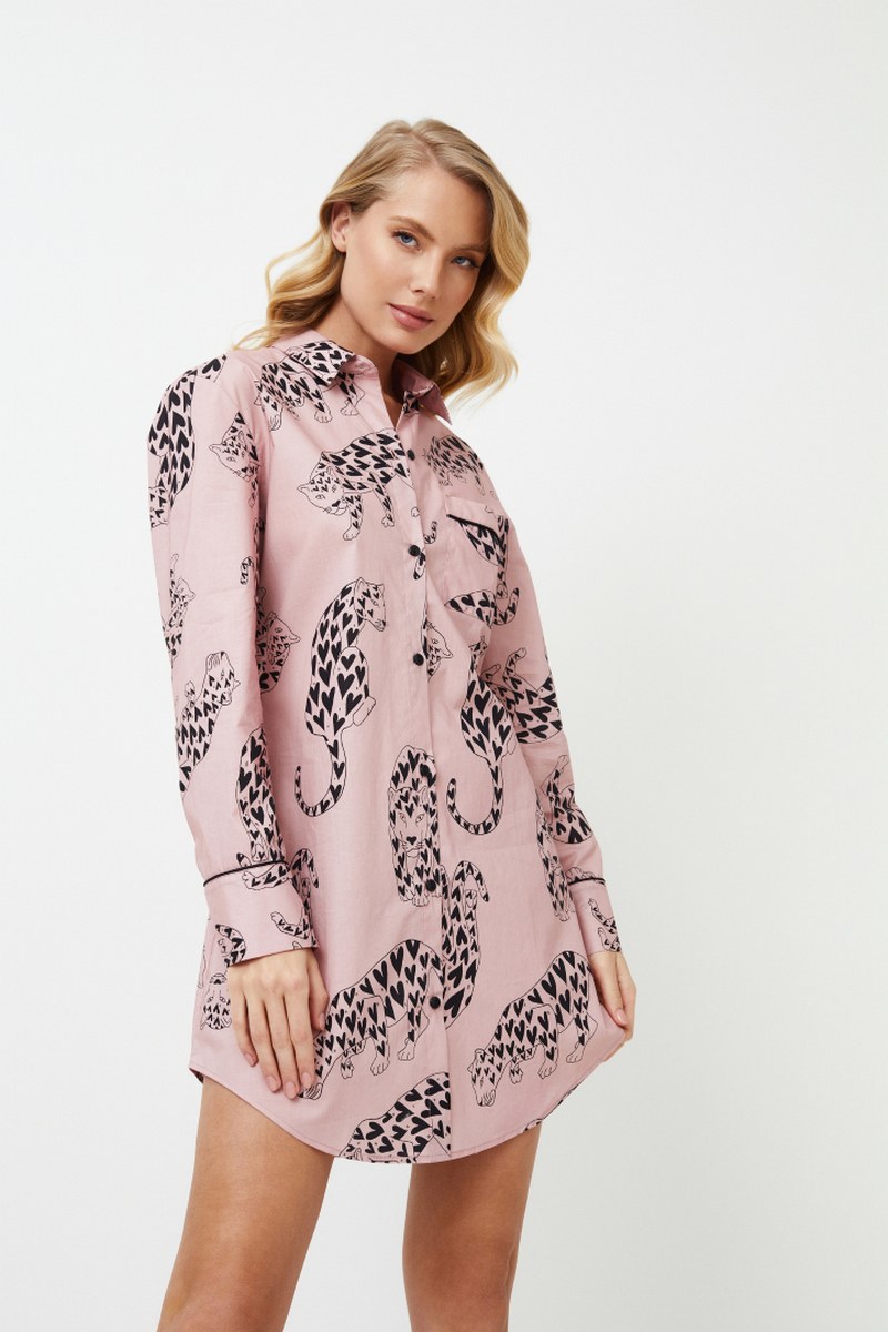 Представляем ночную рубашку Brenda, в которой комфорт и веселье идут рука об руку. Ночная рубашка на пуговицах сшита из розовой хлопчатобумажной ткани, украшенной игривыми черными тиграми в виде сердечек. Она имеет закругленный низ, нагрудный карман и черную окантовку на карманах и манжетах рукавов. Приготовьтесь ко сну в ночной рубашке Brenda, которая превратит каждую ночь в веселое приключение. Изделие выполнено из текстильного хлопка.