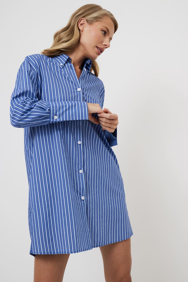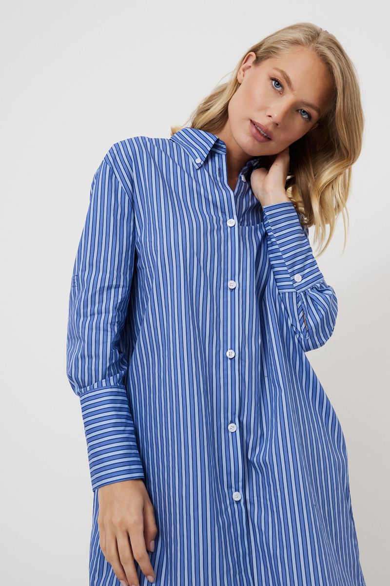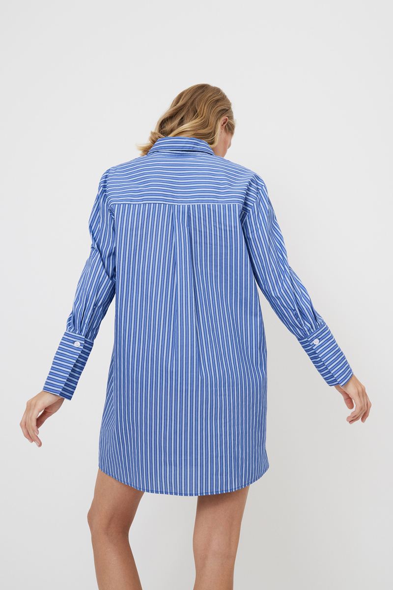 Представляем вам сорочку Lavinia — сочетание непринуждённой элегантности для спокойных моментов у моря или ленивых дней дома. Успокаивающие синие полоски напоминают о спокойном ритме океанских волн, добавляя вашему образу прибрежного очарования. Эта сорочка с длинными рукавами, на пуговицах. Выполнена из лёгкого хлопка, имеет высокие манжеты, кокетку на спине и классический воротник с очаровательной пуговицей. В этой сорочке Lavinia вы будете чувствовать себя стильно и расслабленно, отдыхая на веранде или прогуливаясь по берегу.