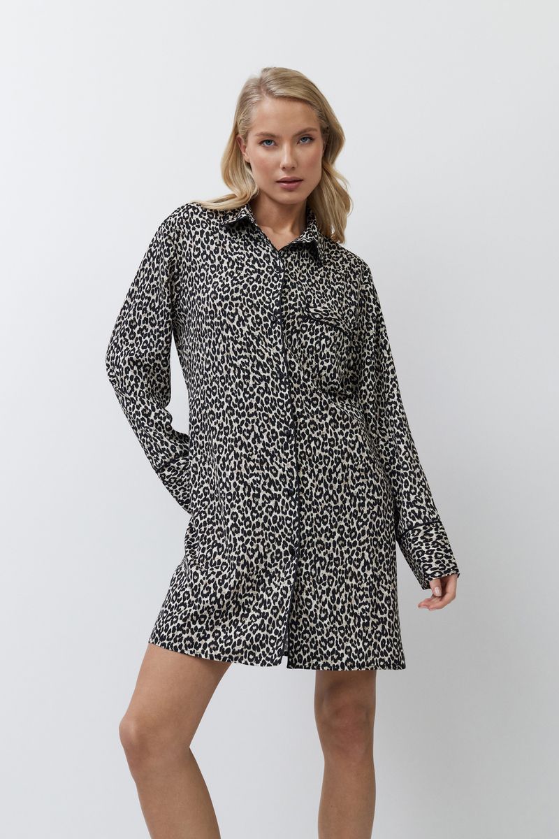 Сорочка женская LEONA для вашего ночного комфорта. Сорочка выполнена из вискозы с легким эластаном, с животным принтом. Сорочка на пуговицах, с длинными рукавами, отложным воротником и нагрудным карманом. Окантовка дополняет и украшает изделие. Расслабьтесь с максимальным комфортом и стилем в сорочке LEONA.