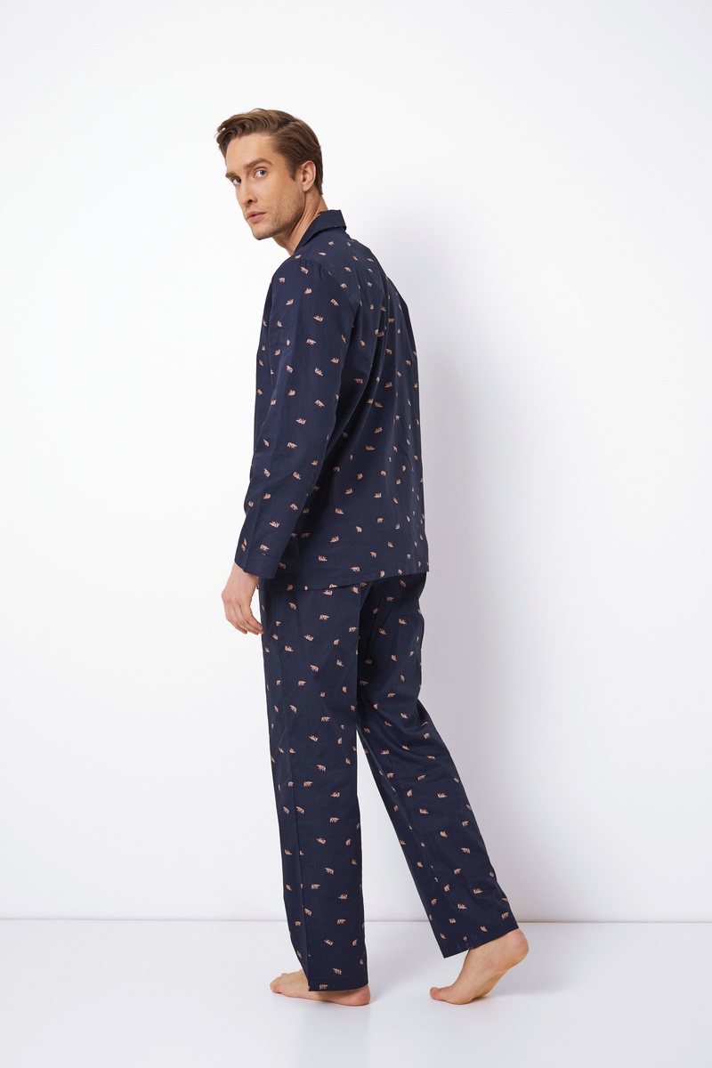 В этой темно-синей пижаме с принтом медведя вы сможете ощутить неподвластный времени стиль! Удобная пижама из чистого хлопка обычного кроя с длинными рукавами и штанинами для тепла. Верх застегивается на пуговицы и имеет мягкий воротник revere. Брюки имеют эластичный пояс и боковые карманы. Изделие выполнено из текстильного хлопка.