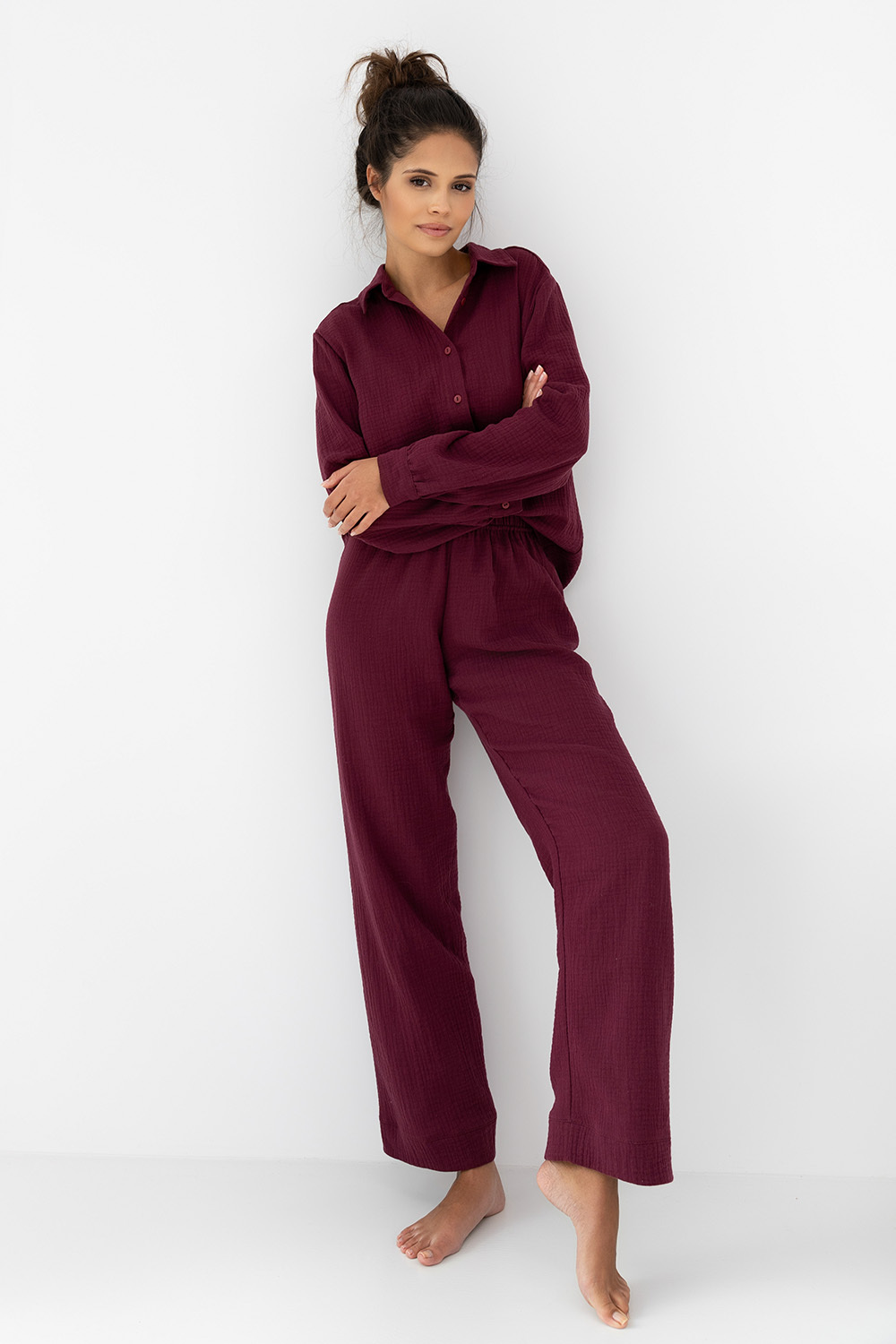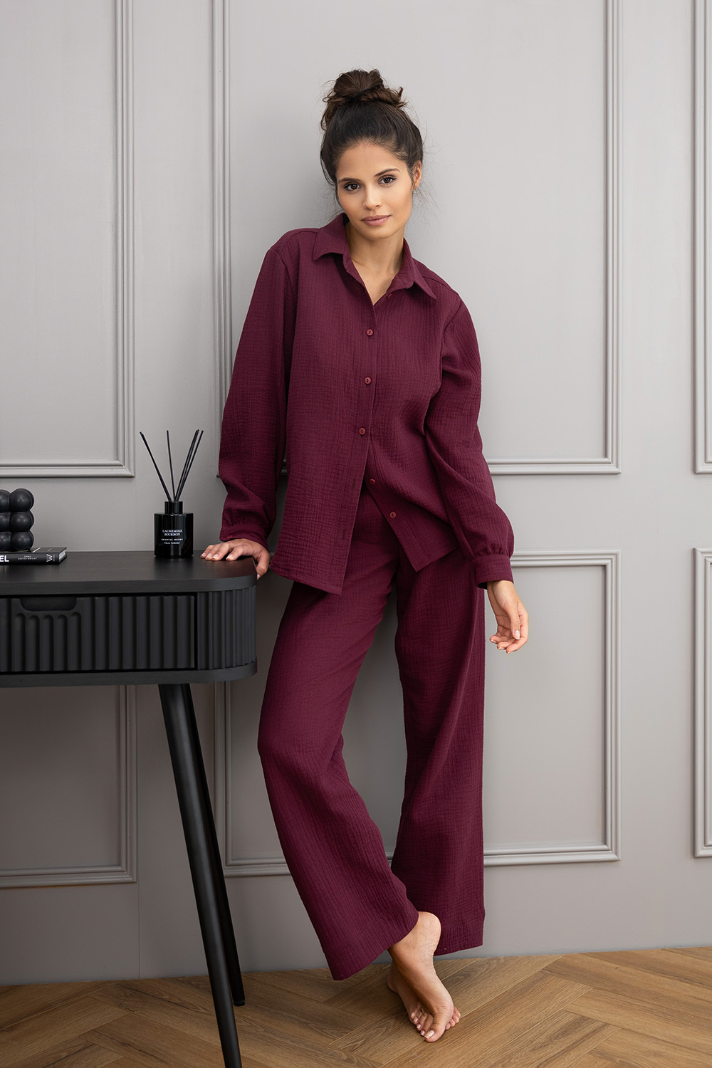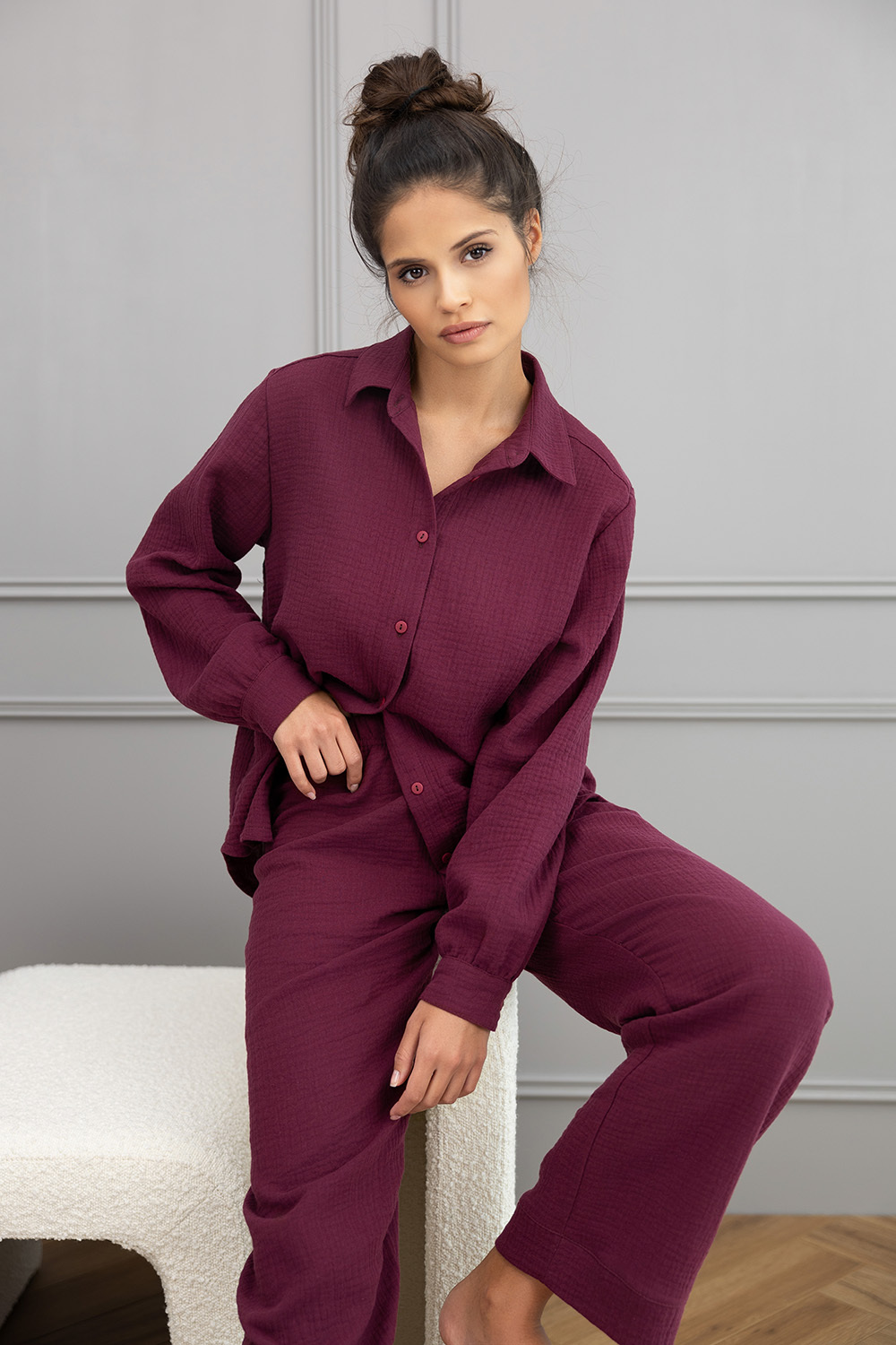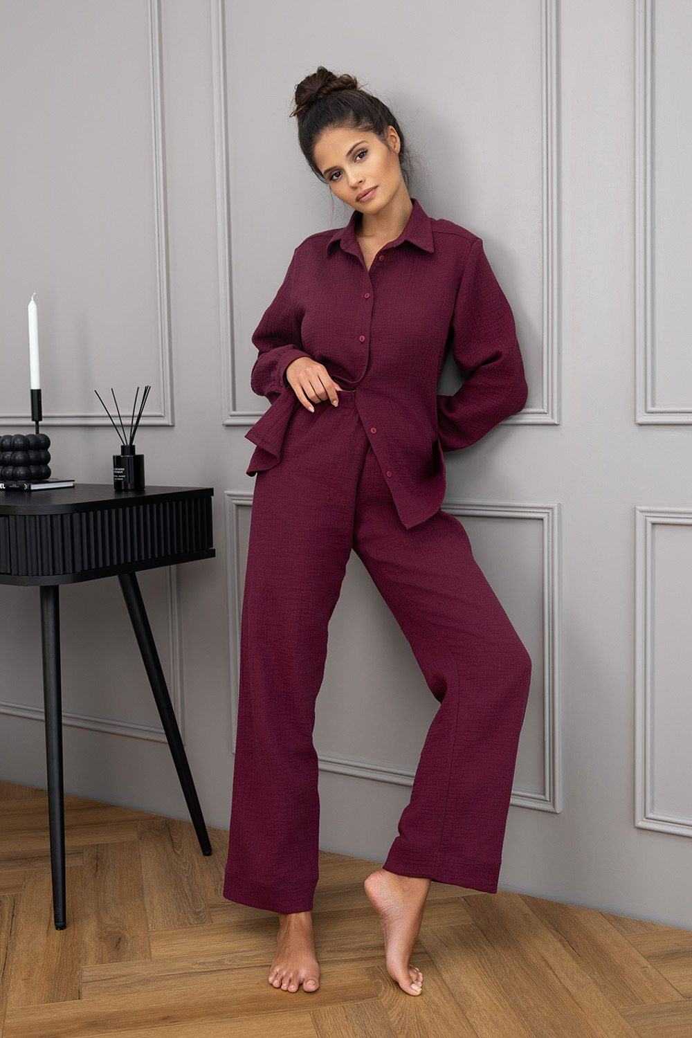 Роскошный комплект Colette винного оттенка состоит из рубашки на пуговицах и брюк-палаццо. Материал изделия легкий, дышащий. Идеальный вариант не только для дома, но и для прогулок.